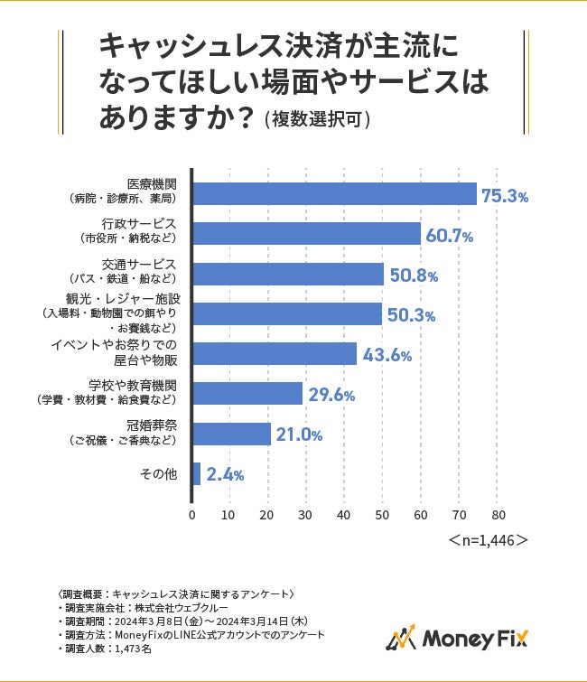 キャッシュレス決済が主流になってほしい場面やサービスについては、「医療機関」(75.3%)が最も多く、「行政サービス」(60.7%)、「交通サービス」(50.8%)と続きました。