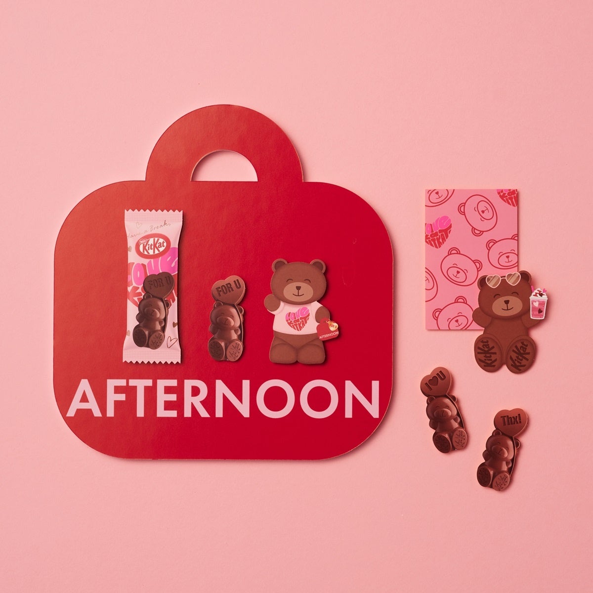 毎年のバレンタインシーズンに登場するクマ型”キットカット”。従来の「キットカット」製品とは形状が異なるユニークな見た目や華やかなパッケージなどが、友人とのシェアやギフトシーンにぴったりと好評です。各製品の個包装正面には “Thx!”, “For U”, “I♡U” など3種類のメッセージがデザインされています。また、裏面には、手書きメッセージ欄が追加され、ちょっとした気持ちをカジュアルに伝えることができます。その他、ケーキにクマ型”キットカット”を飾るなど、手作りお菓子やデザートのデコレーション素材としても活用することができます。