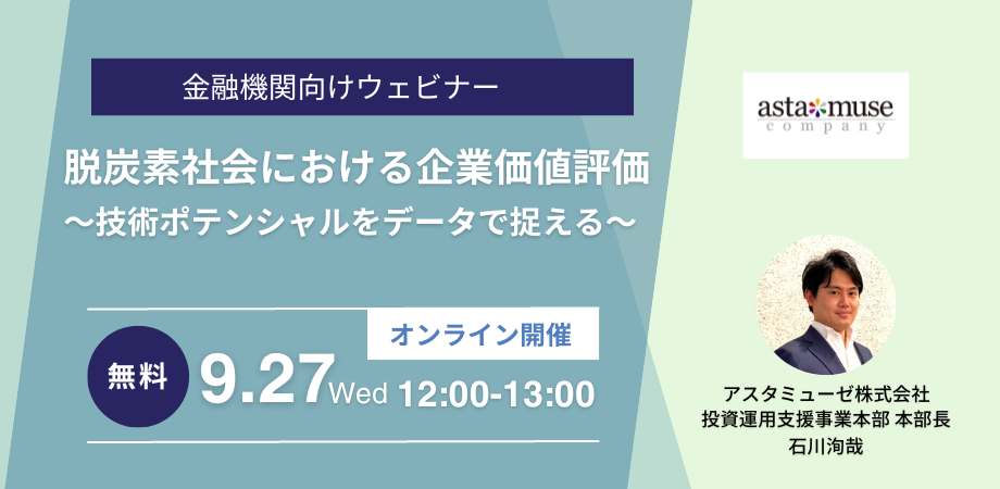 金融機関向け無料セミナー「脱炭素社会における企業価値評価~技術ポテンシャルをデータで捉える~」を9月に開催