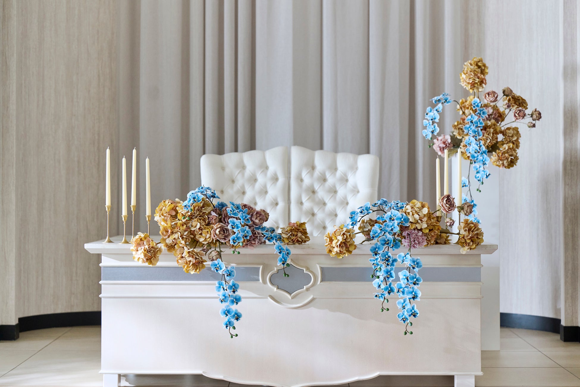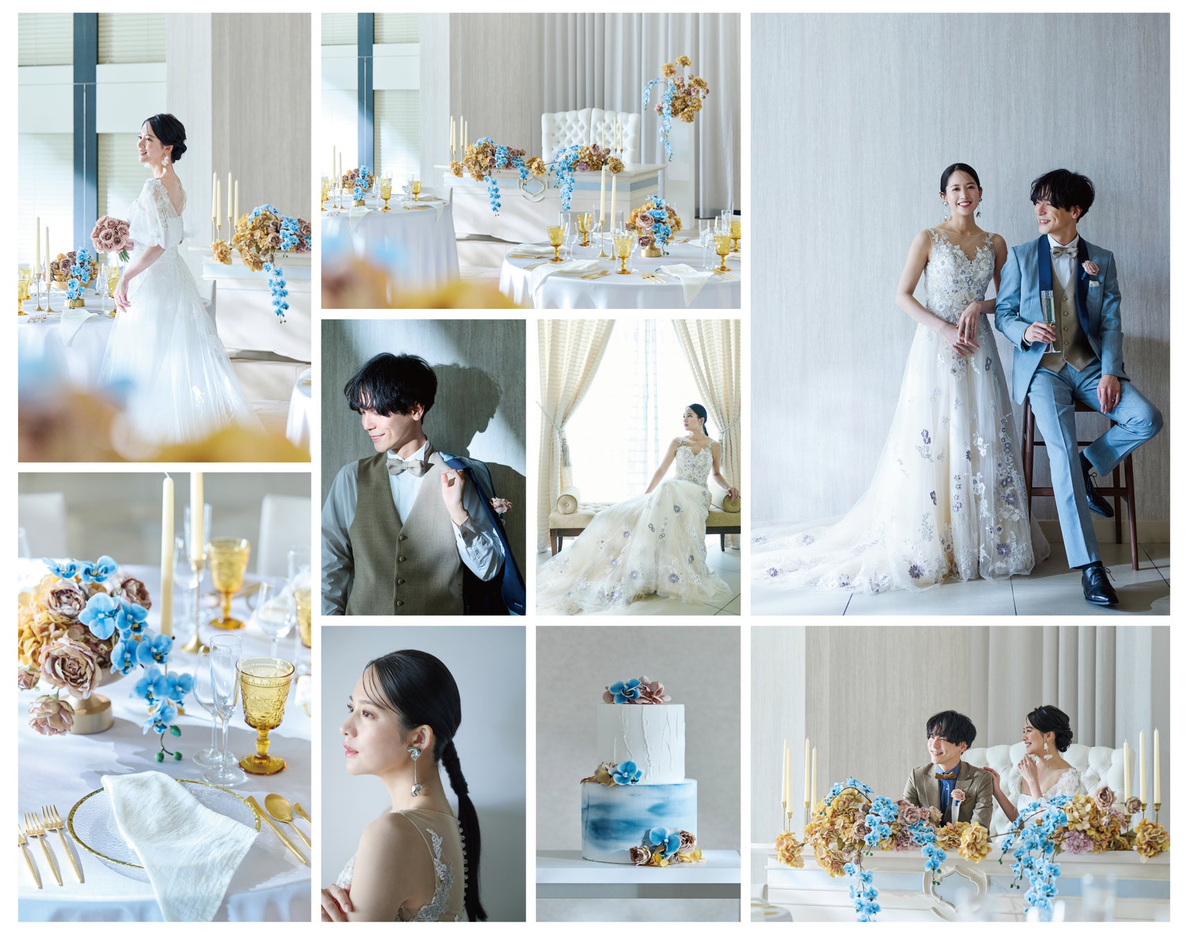 トレンドのくすみカラーの中に青空のような爽やかな色味のブルーを取り入れました。繊細ながらも華やかな刺繍のドレスや流行のフラワーモチーフのアクセサリーをポイントとして使うことでトレンド感を演出します。