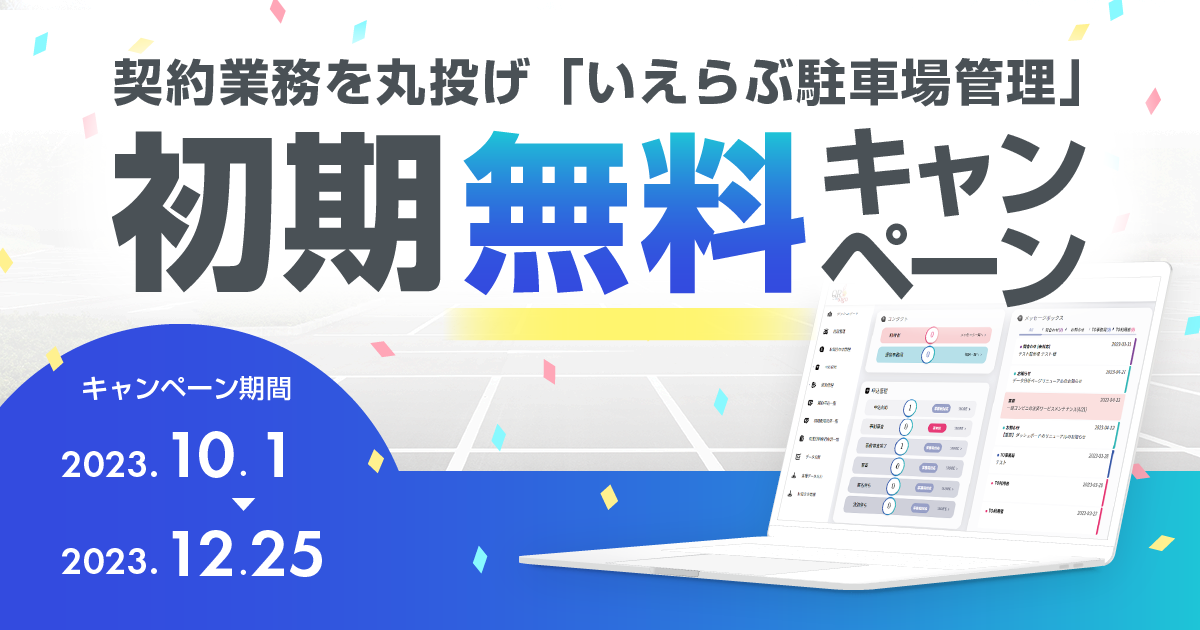 駐車場DXを推進するいえらぶパークは、10月1日から「いえらぶ駐車場管理」を契約する際の初期費用を無料にするキャンペーンを実施します。「いえらぶ駐車場管理」は人手が足りない不動産業界において、駐車場管理業務の工数を約9割減らせる丸投げプラン、最短30分で契約できるオンラインの契約システム、グループ会社による手厚い保証が評価され、阪神高速サービス株式会社をはじめとする多くの企業に導入されています。
