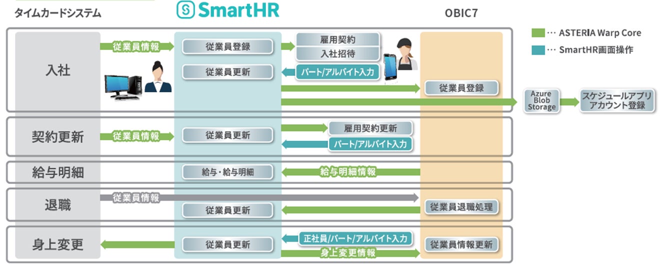 そこでリンガーハットでは、クラウド人事労務ソフト「SmartHR」を導入し人事労務管理業務のデジタル化・効率化を推進。また、勤怠管理システム(基幹システム)や給与情報システム「OBIC7」とSmartHRの連携基盤としてWarp Coreの採用を決定しました。これにより、リンガーハット社内で稼働するシステムとSmartHRの連携基盤開発をノーコードで実現し、開発工数の削減に成功。複数のシステムが連携したことによって、店舗責任者が担当する人事関連手続きが整流化され人事労務管理業務の軽減も実現されたことから、店舗責任者は店舗運営や人材育成に時間を割くことができるようになりました。