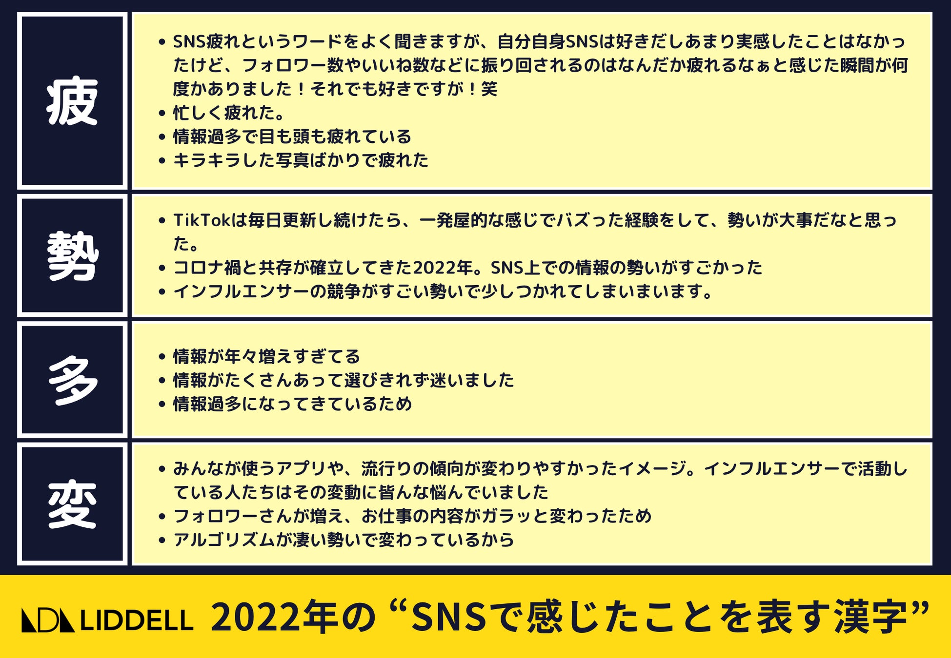 SNS・インフルエンサーマーケティング事業を展開するLIDDELL株式会社 (本社:東京都港区、代表取締役:福田 晃一、以下リデル) は、インフルエンサーを対象に、漢字一文字で表す「今年SNSで感じたこと」を調査しました。
