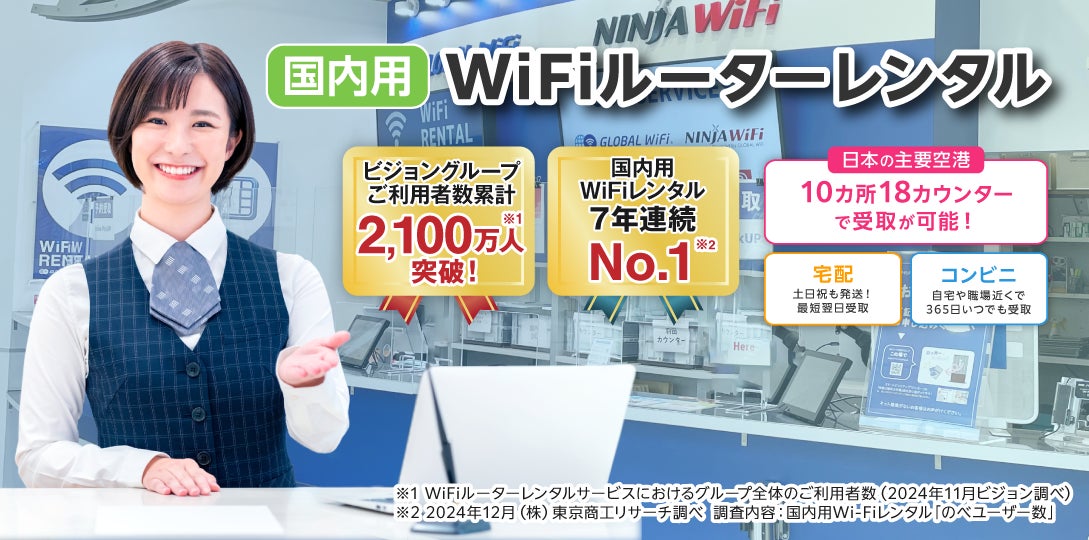 「人と人をつなぐ。」「世界をつなぐ。」のテーマのもと、グローバルWiFi事業、情報通信サービス事業、グランピング・ツーリズム事業を展開する株式会社ビジョン(本社:東京都新宿区 代表取締役社長 COO:大田健司、以下ビジョン)が手掛ける、「WiFiレンタルどっとこむ®」がこのたび、株式会社東京商工リサーチの調査により、国内用Wi-Fiレンタル市場において7年連続で利用者数1位となりました。