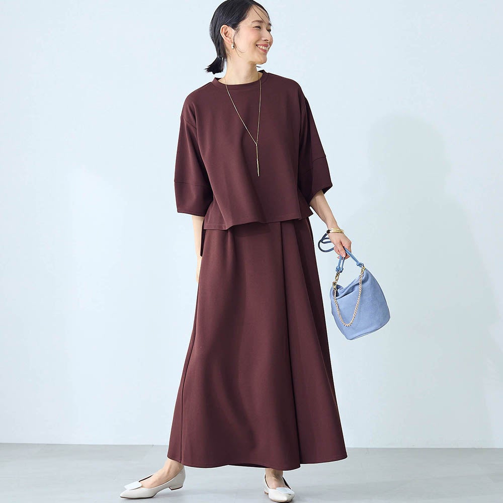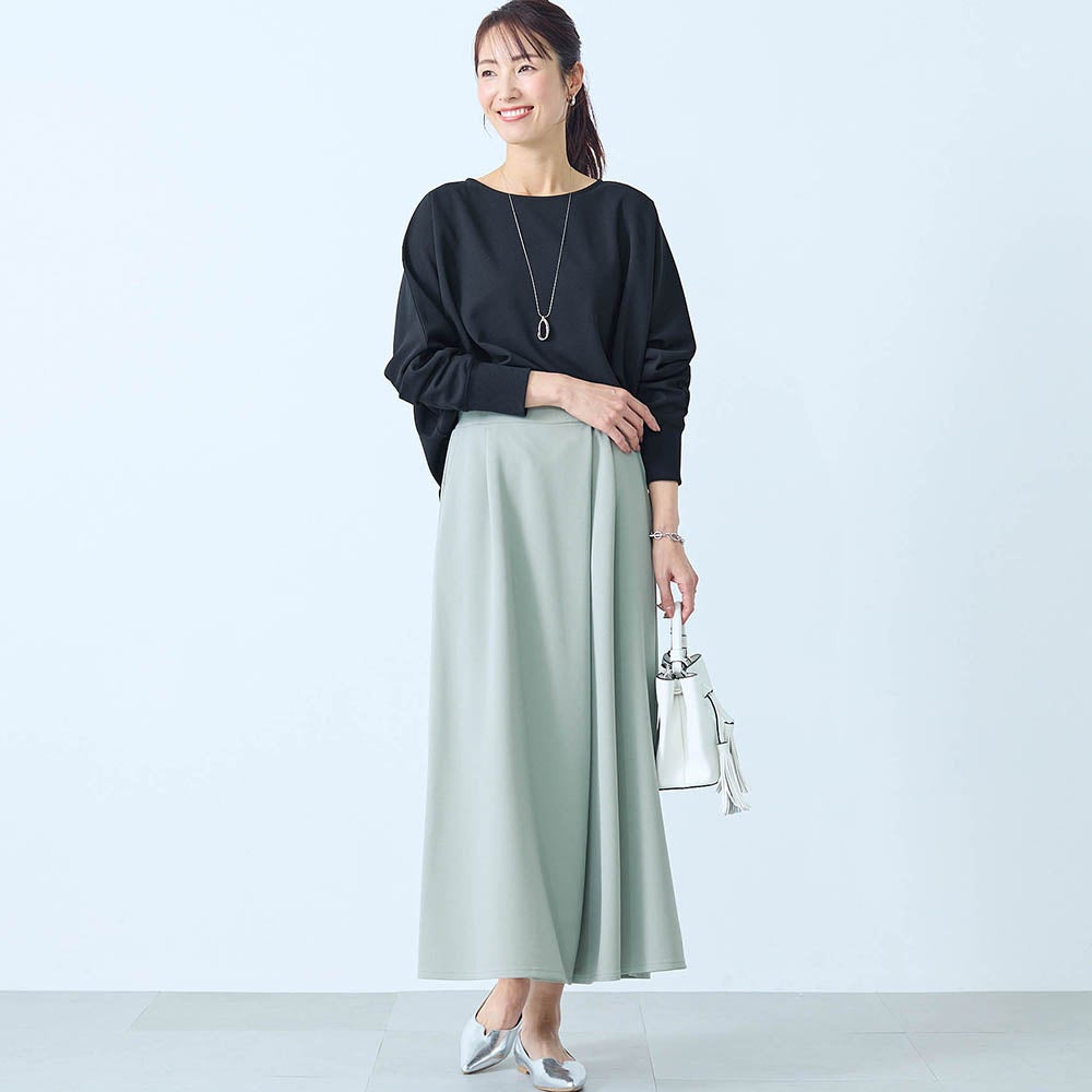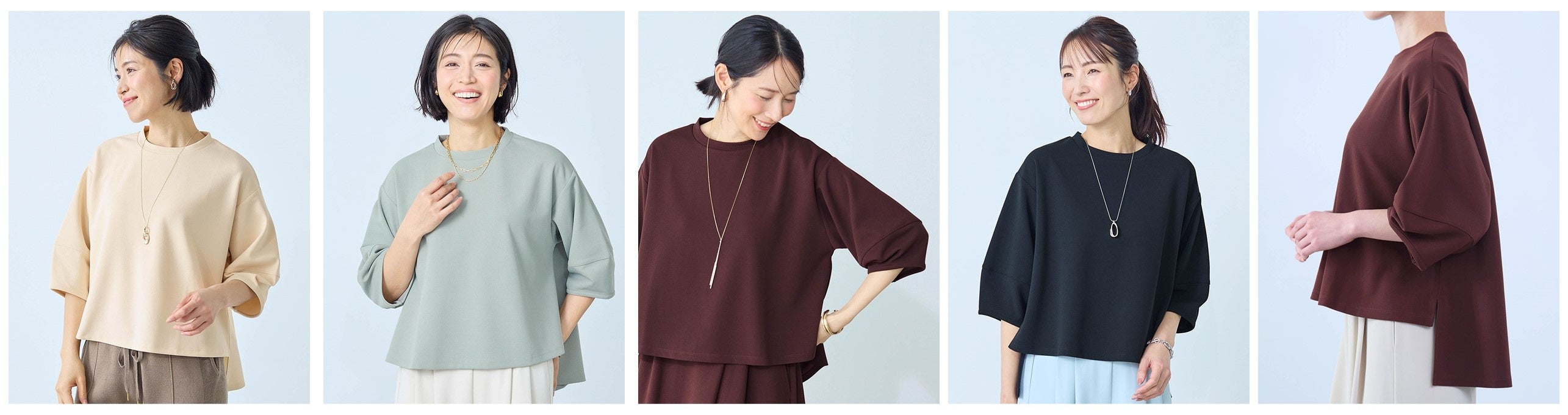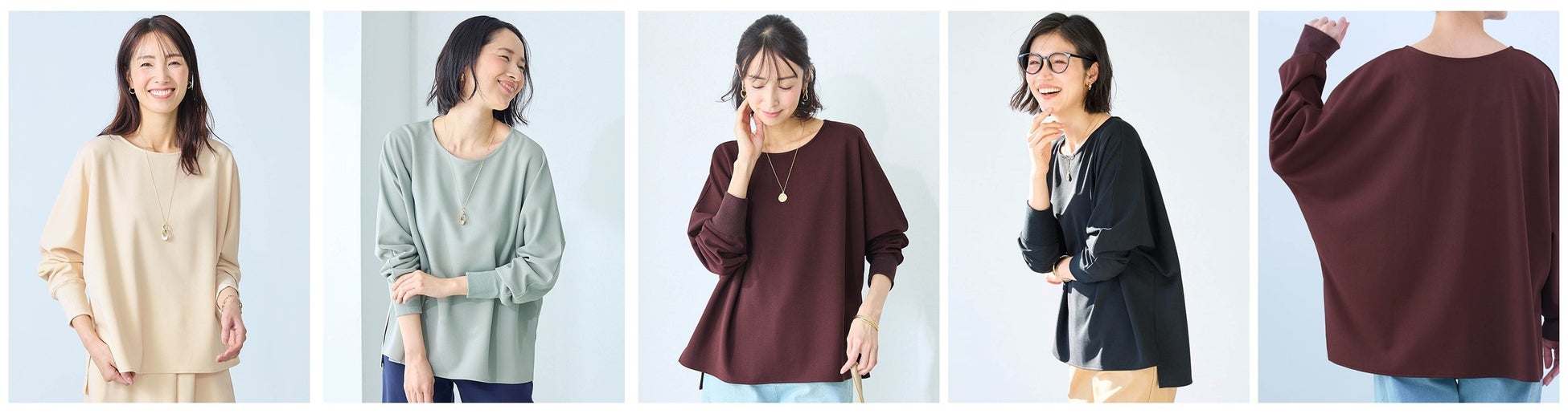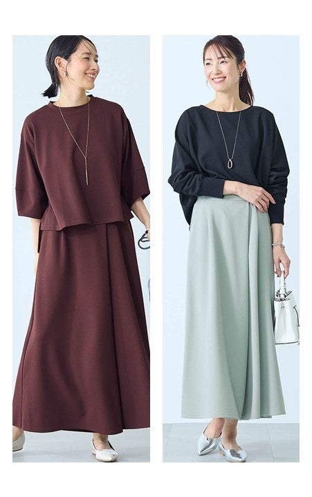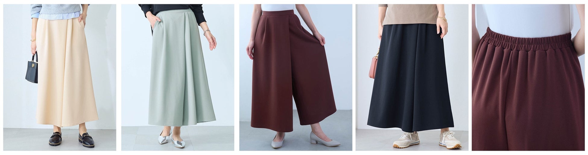 アイテムはデザインが異なるブラウス2種と、セットアップで着用できるスカーチョ(スカートのように見えるゆったりとしたシルエットのパンツ)の3アイテムです。カラーはオフベージュ、ブラウン、ブラックの定番の3色に加え、春夏向けの爽やかなソフトグリーンを含む全4色です。サイズ展開はSから6Lまでと幅広く揃えています。