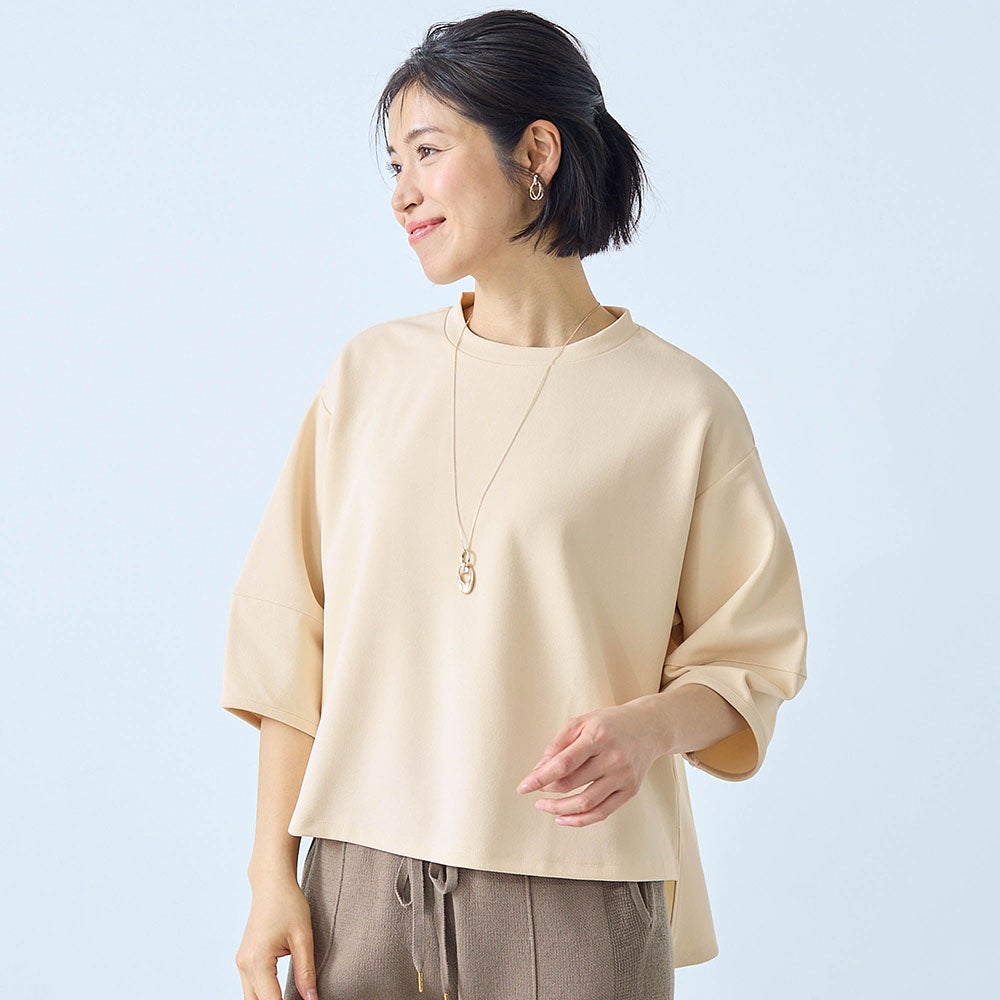 ・ドルマンスリーブで二の腕をすっきり見せ、袖口リブでたくし上げやすいデザイン