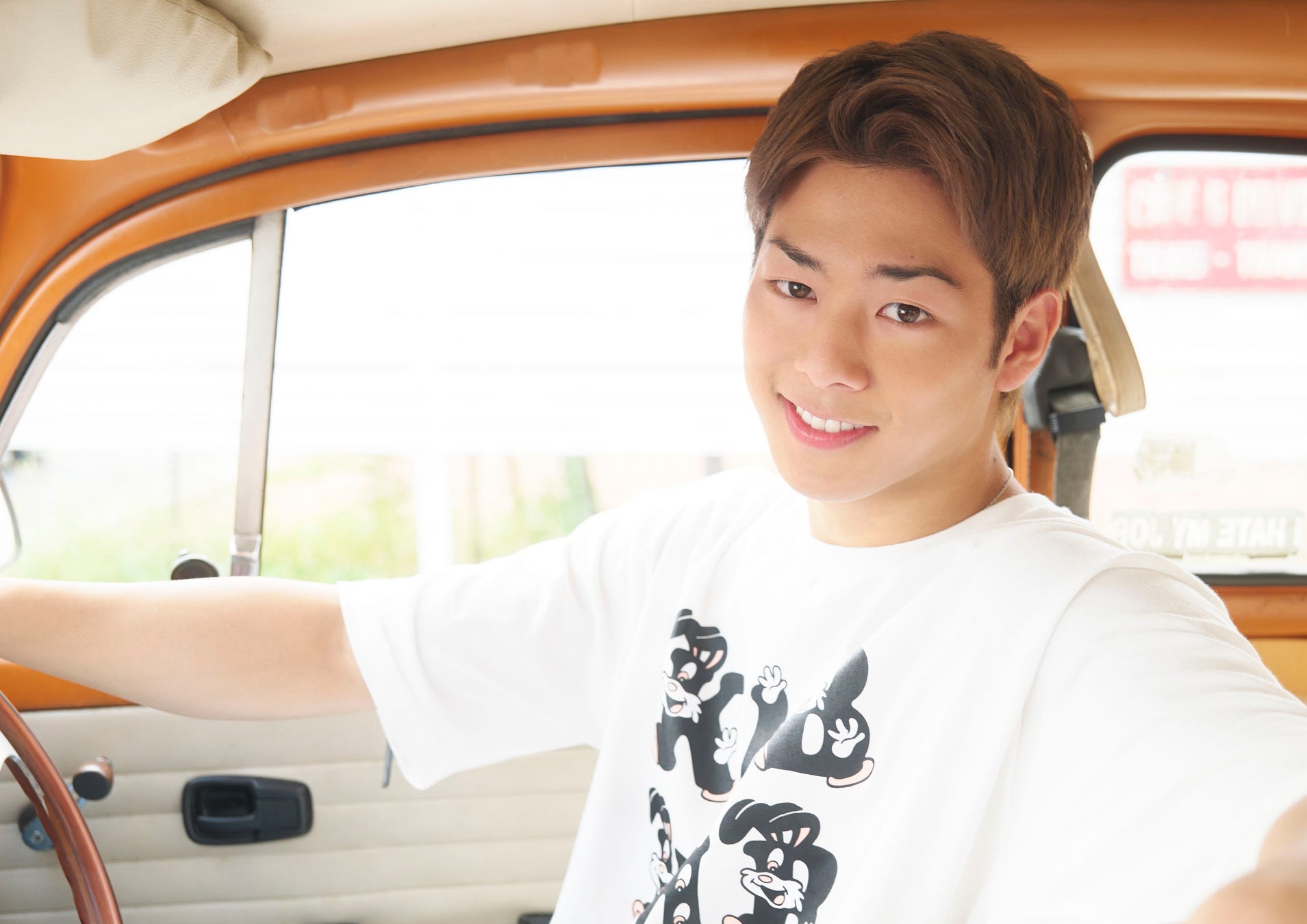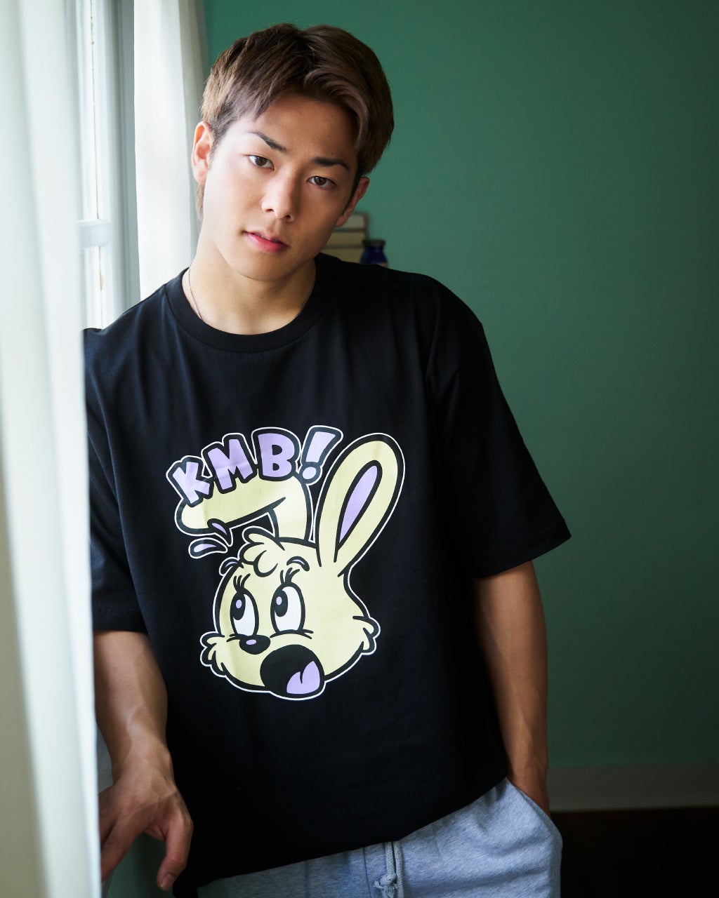 着用しているTシャツも「KMB」ブランドのもの。今後発売予定のデザインです。