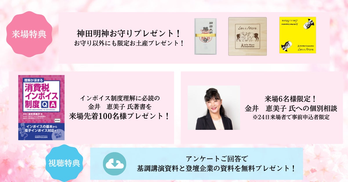 会場では事前予約制で金井 恵美子氏との個別相談会(※)や、来場者先着特典として金井氏の著書をはじめとするプレゼントを多数ご用意しております。オンラインでご視聴いただいた方にも、基調講演の講演資料がもらえるアンケート企画を実施します。