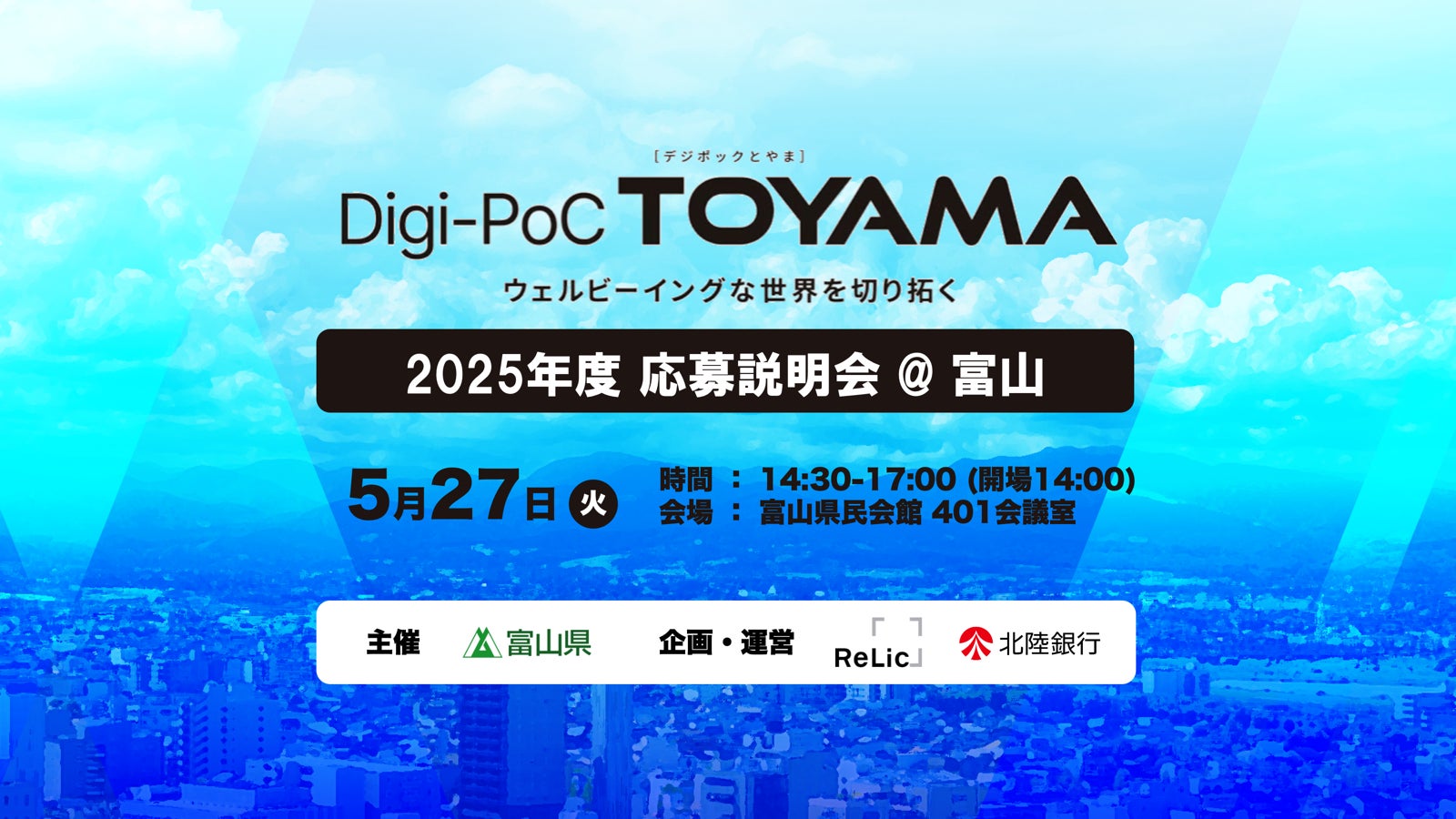 事業共創カンパニーである株式会社Relic(本社:東京都渋谷区、代表取締役CEO:北嶋貴朗、以下、Relic)は、昨年度に続き、富山県が実施している、デジタル技術を活用して地域課題を解決する実証実験プロジェクト「Digi-PoC TOYAMA(デジポックとやま)」の令和7年度運営事業者へ採択されたことをお知らせします。本採択は北陸銀行と共同企業体としての採択で、富山県内に強固なネットワークを持つ北陸銀行と、4,000社20,000件以上の新規事業開発/イノベーション創出支援実績を持つRelicによるコラボレーション施策です。また令和7年度の運営開始を受け、プログラムや本プログラムを通して募集する実証実験プロジェクト概要に関する説明会を開催します。