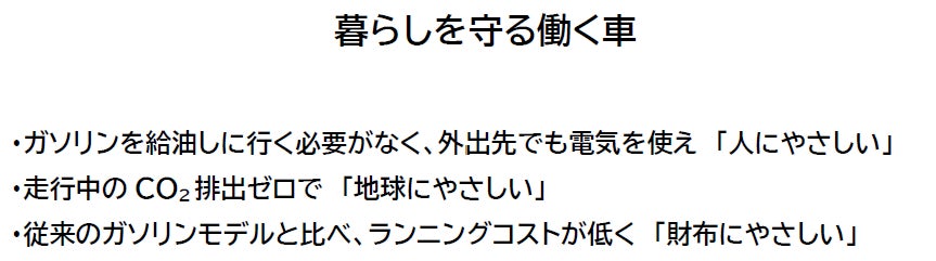 ・加えて災害時などで電力が必要な時は、車両の走行機能を停止した状態で給電ができる非常時給電システムも搭載