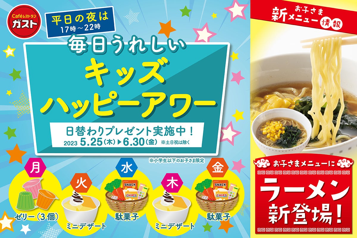 ガスト初開催のお得な「キッズハッピーアワー」では、小学生以下のお客さま対象で毎日日替わりのプレゼントをお渡しします。また、お子さまに人気の麺メニューに「ラーメン」が新登場いたします。