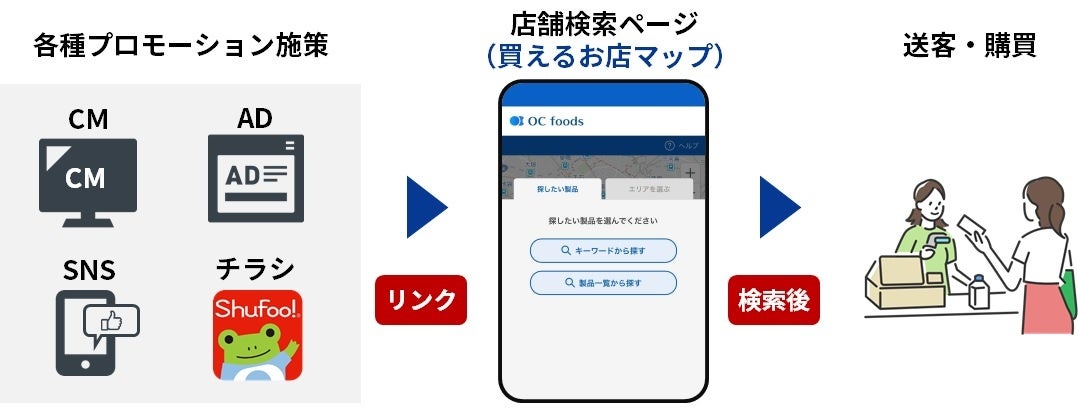 そこで、「取扱い店舗検索」をこれまでの問い合せ業務の負荷軽減から、来店・購買の可能性がある生活者をスムーズに販売店へ誘導させるほか、SNS施策や「Shufoo!」との連携も可能とし、また分析機能を充実させることで、生活者視点に合わせたプロモーションやマーケティングにも活用いただけるサービスへ強化します。それに伴い「買えるお店マップ」にサービス名を変更します。