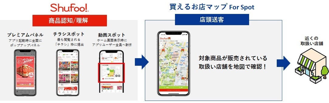 当社が運営する日本最大級の電子チラシサービス「Shufoo!」の各広告メニュー(プレミアムパネル、チラシスポット、動画スポット)から「買えるお店マップ」に連動できるサービスです。
