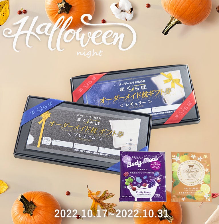 オーダーメイド枕の店まくらぼを運営するFutonto株式会社(本社:東京都町田市 代表取締役社長:齊藤淨一、以下Futonto)は、2022年10月17日(月)から10月31日(月)までの期間、一人ひとりにぴったり合った「オーダーメイド枕」を作成できるギフト券に特典として入浴剤が付くハロウィンキャンペーンをまくらぼのオンラインショップ限定で実施しております。