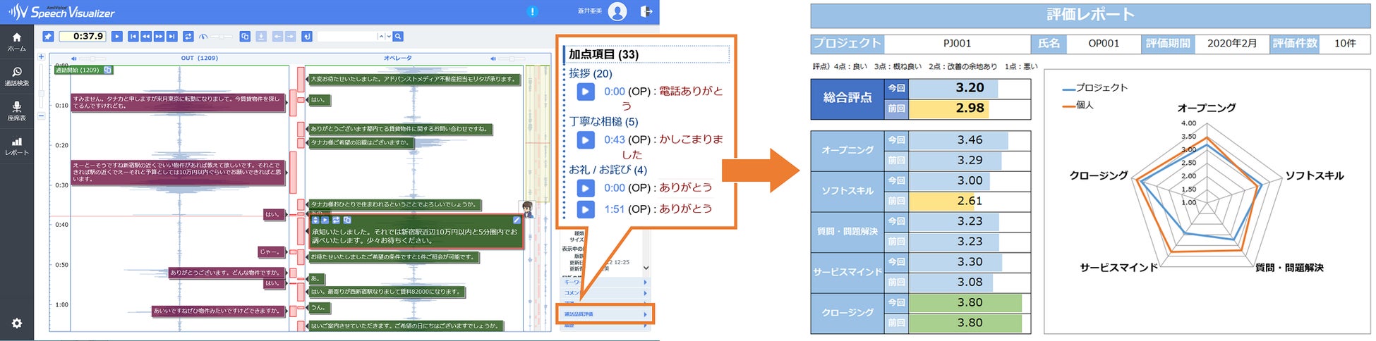 音声認識により文字化された全ての通話データを自動評価・採点し、モニタリング業務の効率化、評価の平準化を実現します。