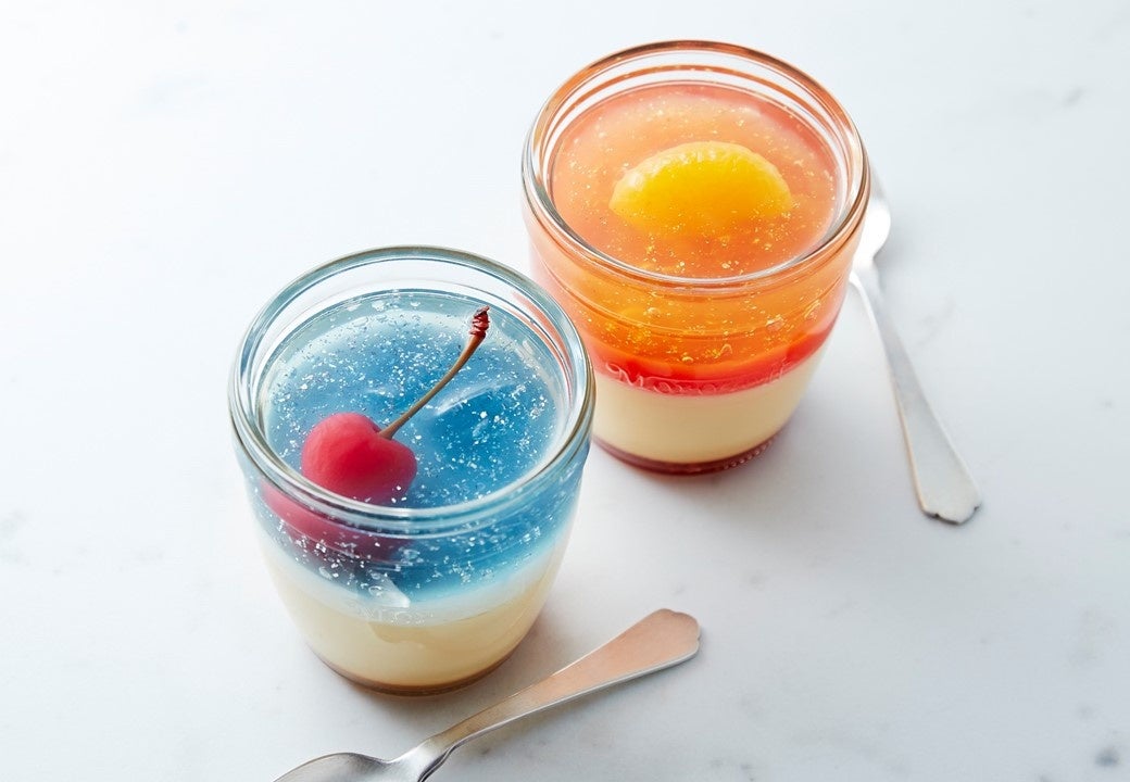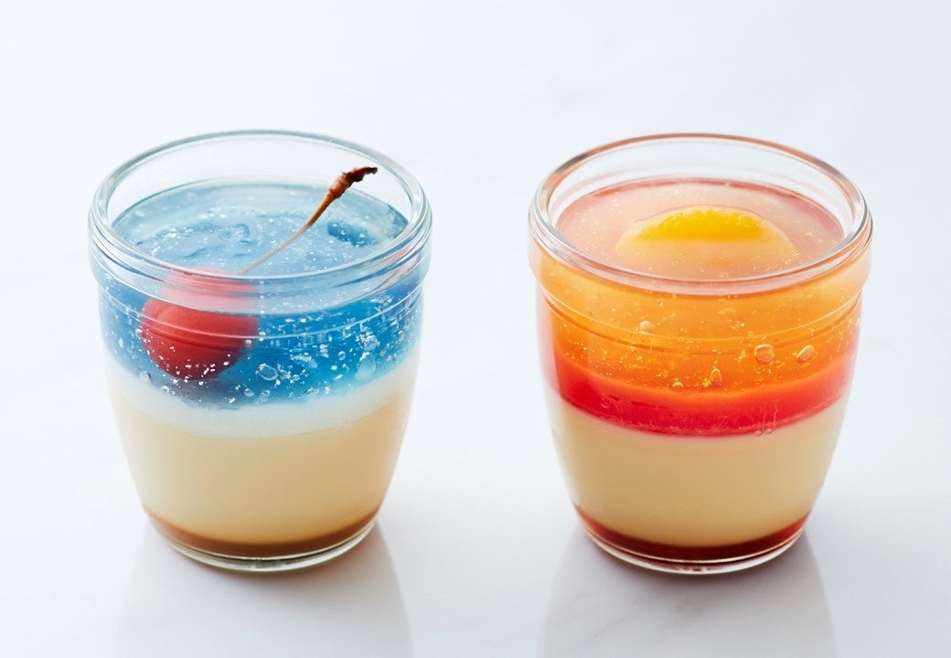 コクのある甘みを楽しめるマンゴーゼリーとすっきりとしたオレンジゼリー、夕日をイメージした甘夏、モロゾフ定番のカスタードプリンにほろ苦いカラメルソースを合わせました。ほろ苦いカラメルソースと甘酸っぱい甘夏やマンゴーの甘みが相性の良い組み合わせです。