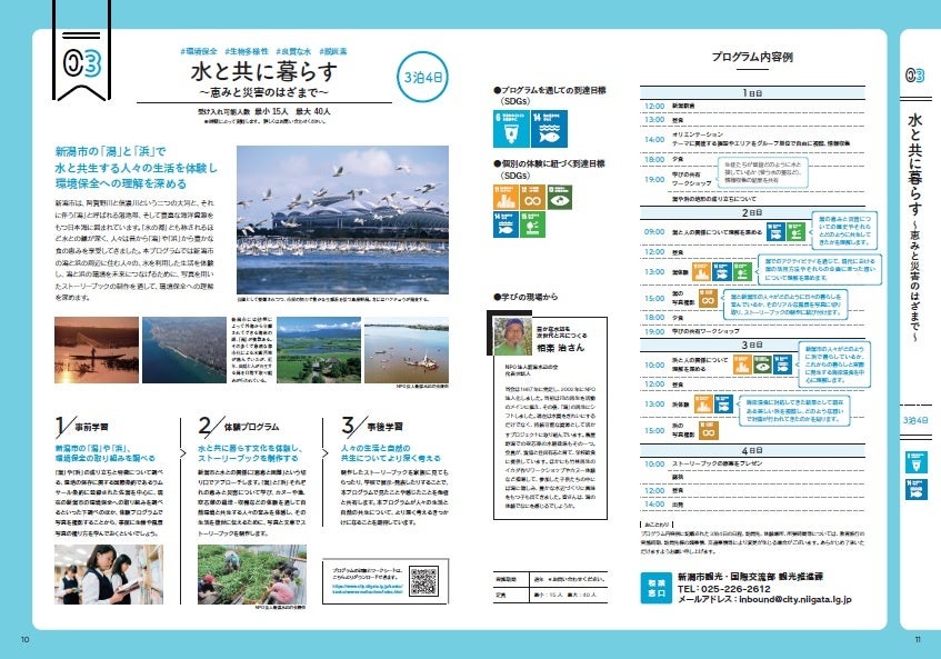 新潟市新しい観光スタイル推進協議会では、株式会社学研ホールディングスのグループ会社である株式会社地球の歩き方及びアイ・シー・ネット株式会社の協力のもと、修学旅行などで活用できる体験プログラムを構築しました。本プログラムでは現地での体験と事前・事後学習を通して新学習指導要領に対応した主体的・対話的な深い学びを提供し、SDGsの目標達成に寄与するとともに、生徒が社会課題を自分事として捉える原体験となることを目指した内容となっています。