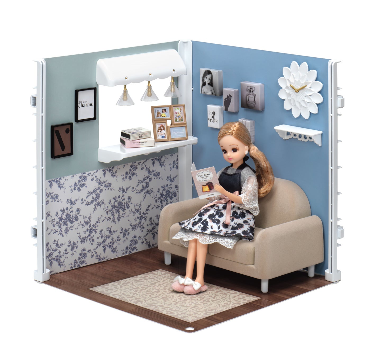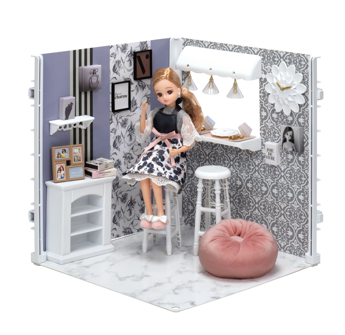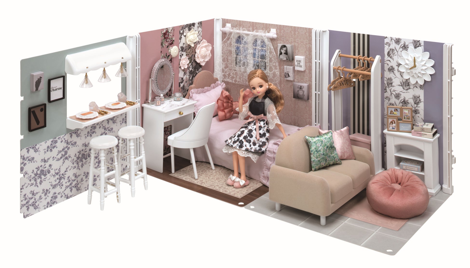 リカちゃんの世界観でインテリアコーディネートを楽しめるルームです。床、壁シートは表裏でデザインが異なり、バリエーションが楽しめます。別売りのアイテムを組み合わせるとさらにインテリアコーディネートの幅が広がります。また、ルーム(2種)は連結可能で、拡張して大きなルームとして楽しんでいただくこともできます。