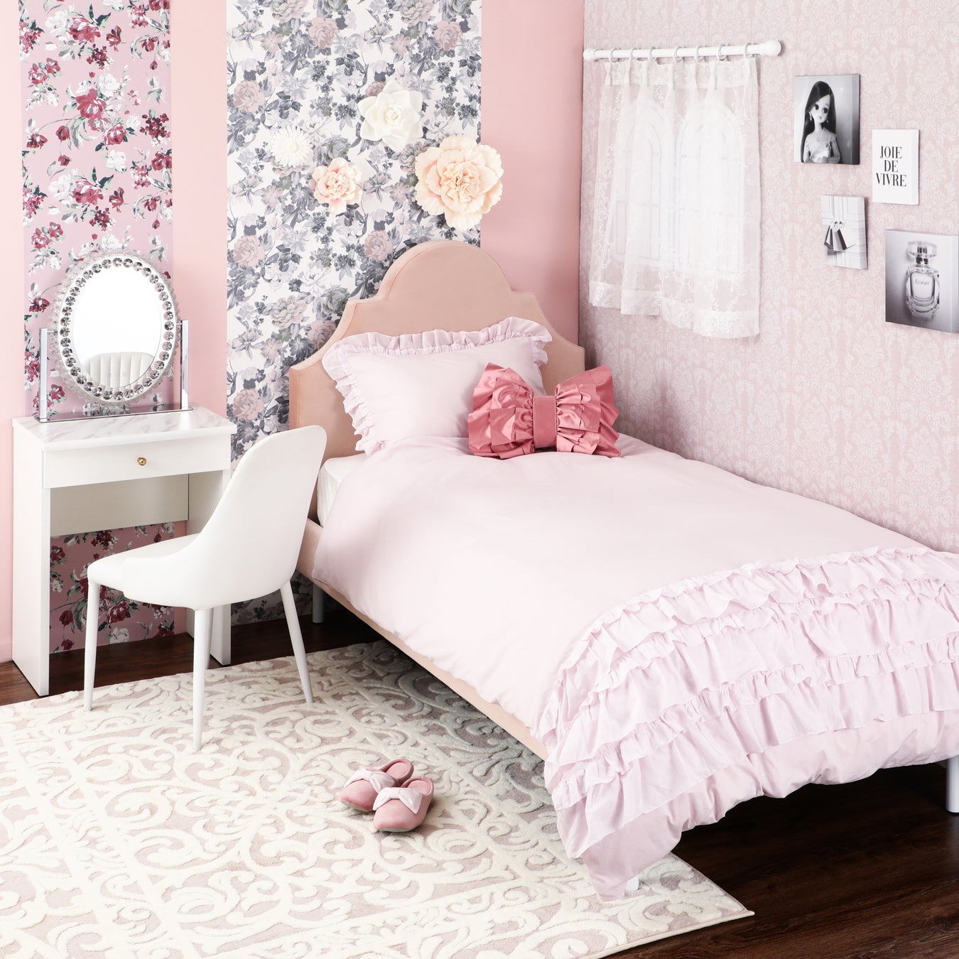 王冠型のエレガントなベッドフレームにフリルをあしらった掛け布団とまくらのセットです。