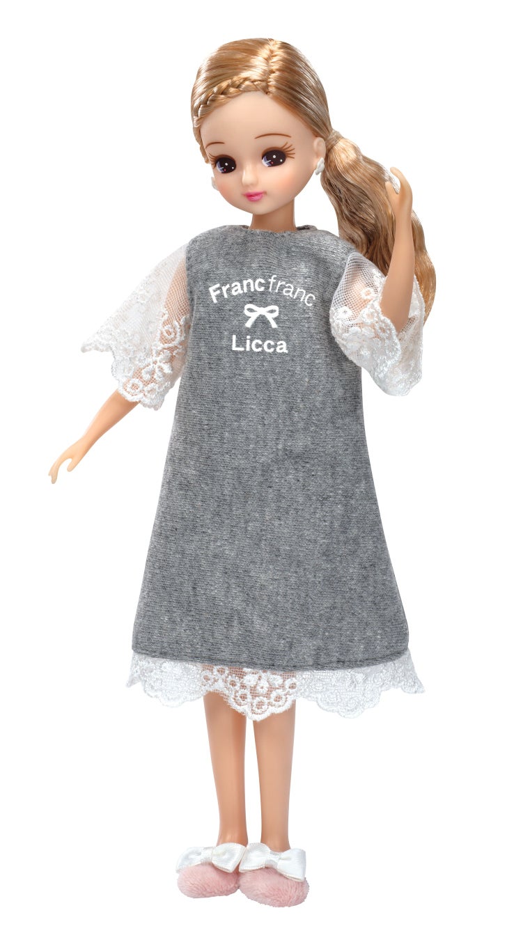 実際の商品を再現したエプロンやミトン、ルームシューズとリカちゃんオリジナルデザインのルームウェアを身に付けたリカちゃんです。エプロンの下のルームウェアはリカちゃんオリジナルデザインとなっており、胸元に「Licca」と「Francfranc」のロゴが入っています。別売りのインテリアコーディネートシリーズのシーンにぴったりのリカちゃんです。