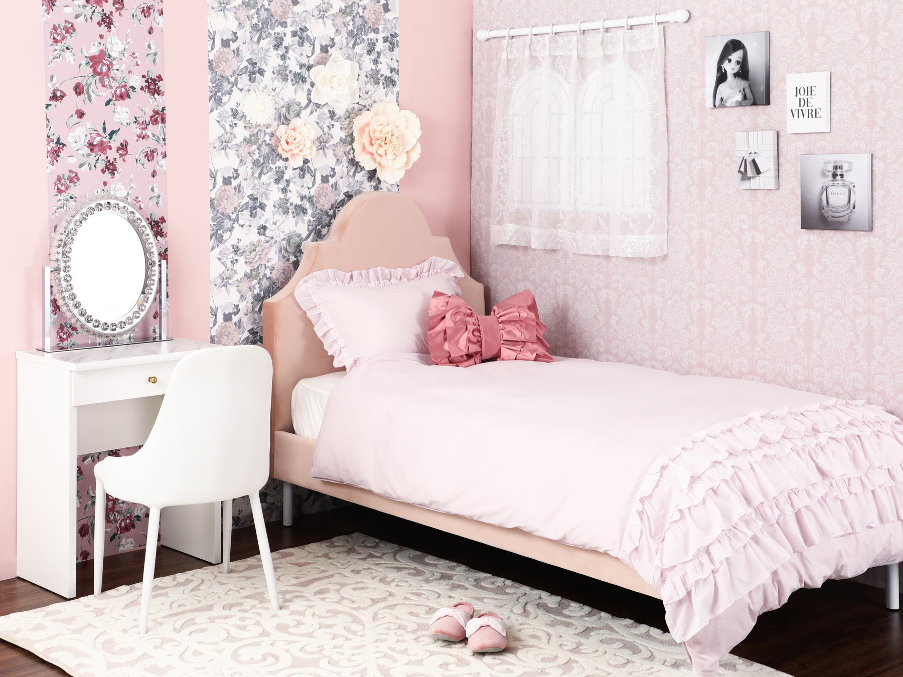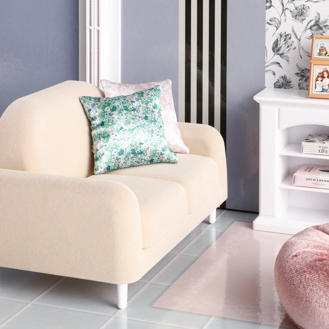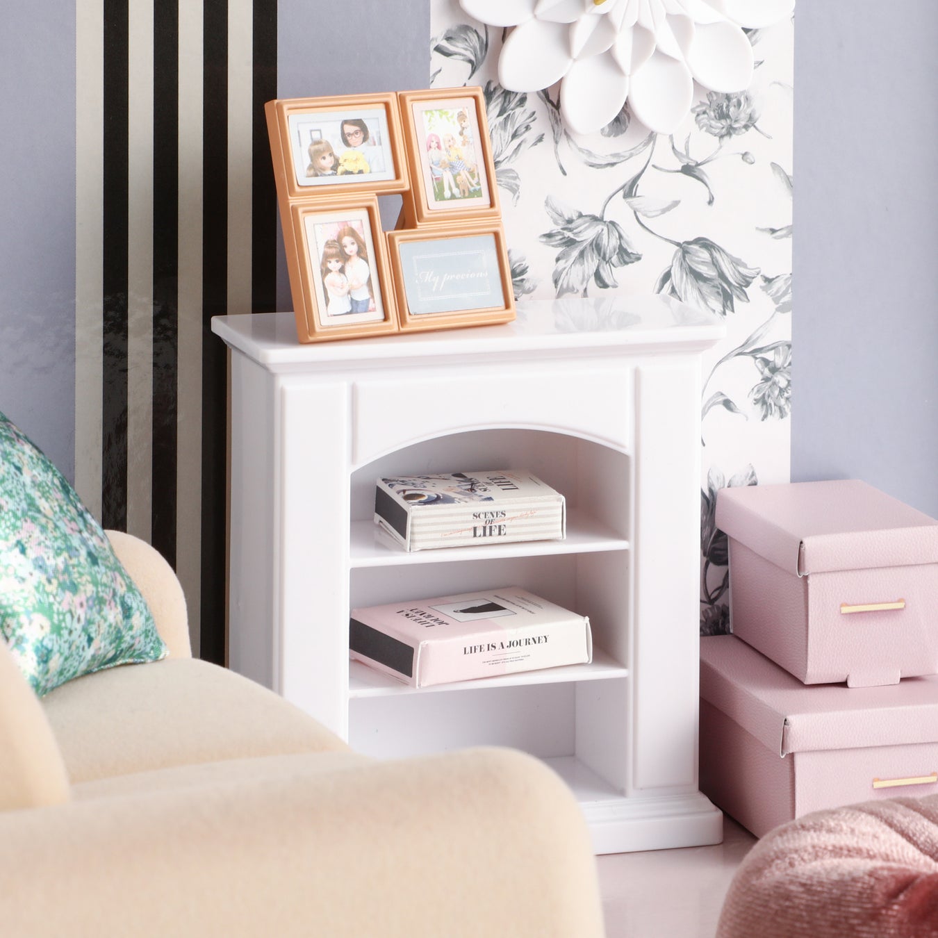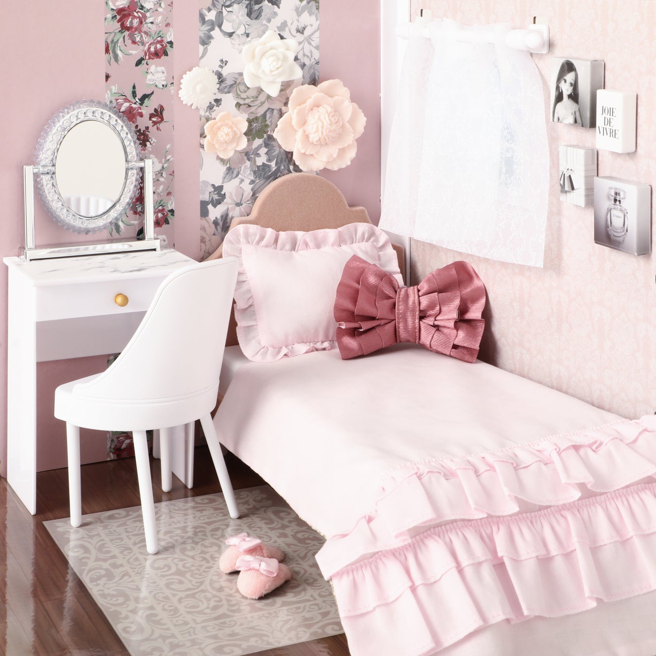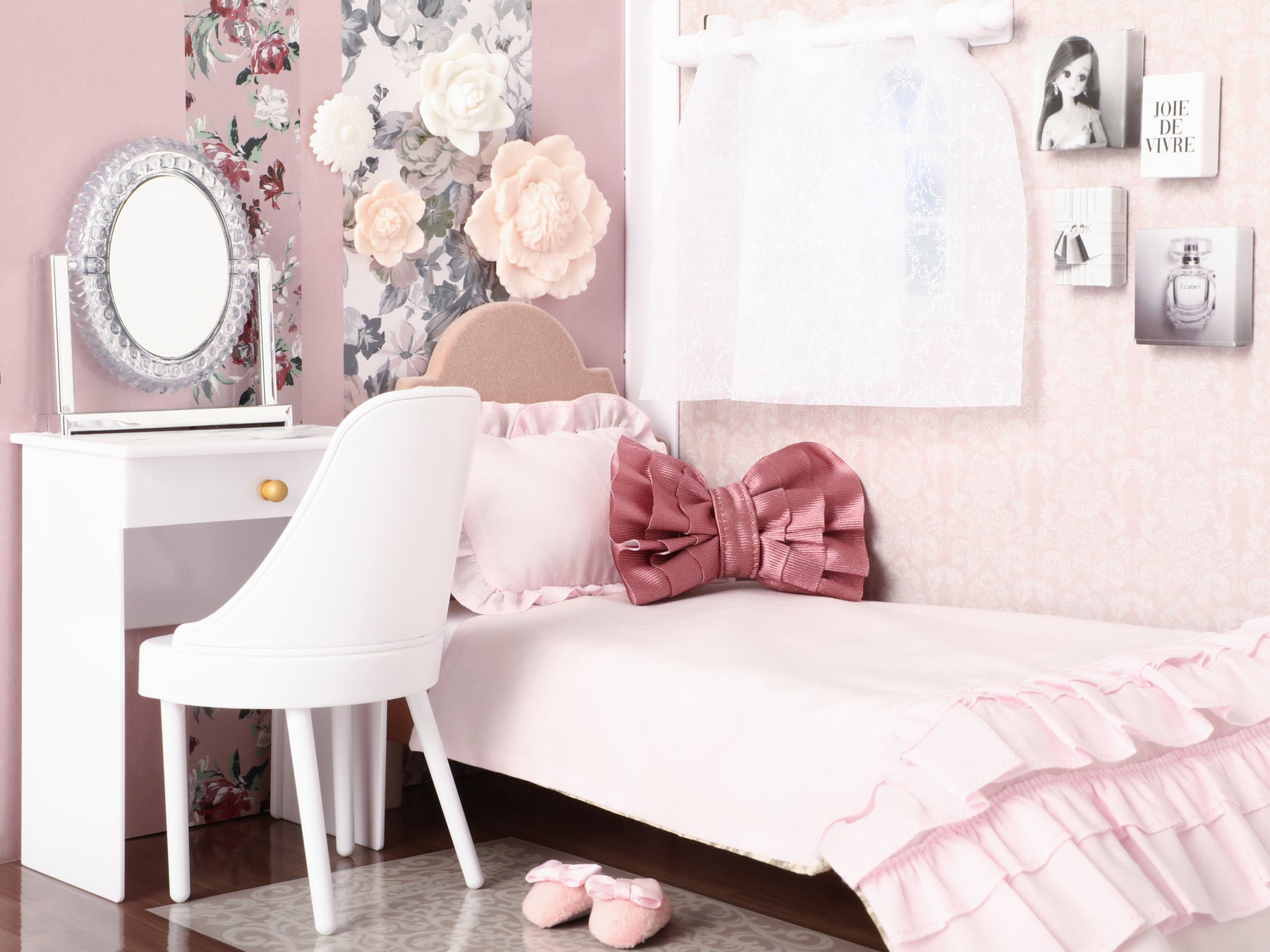 Francfrancの人気アイテムであるハリウッドミラー、ウォールフラワー、アートボード、マントルピース、リボン型クッションなどをリカちゃんサイズで再現しています。
