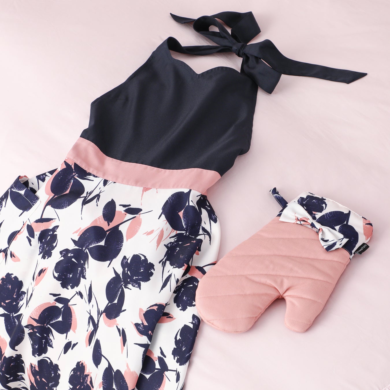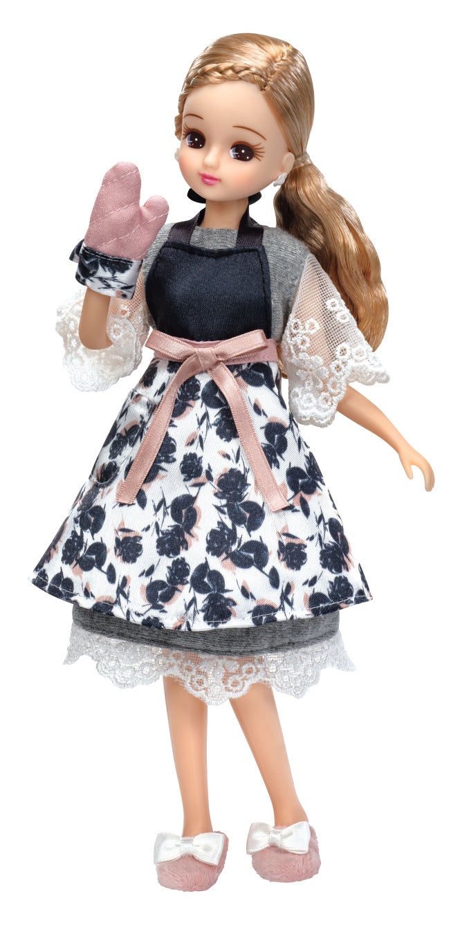 ドール「Francfrancだいすきリカちゃん」は実際の商品を再現したエプロンやミトンと、リカちゃんオリジナルデザインのルームウェアを着用しています。前髪を編み込んだサイドポニーのヘアスタイルもポイントです。
