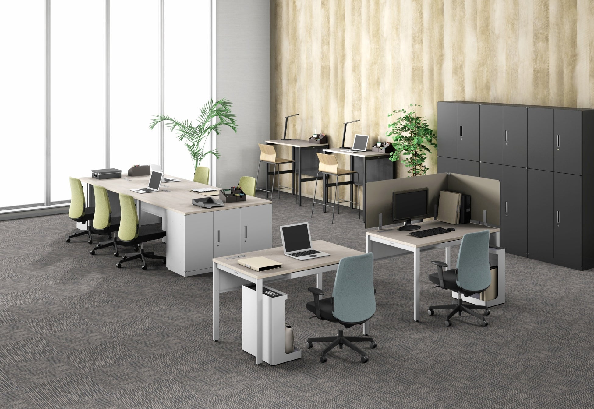 すっきりとした印象ながらも天板耐荷重は100kg(天板1枚あたり)とオカムラ品質の耐久性を兼ね備えているため、安心して使用できます。また、リサイクルのしやすいスチール素材をメインに使用することで、環境配慮も行っています。
