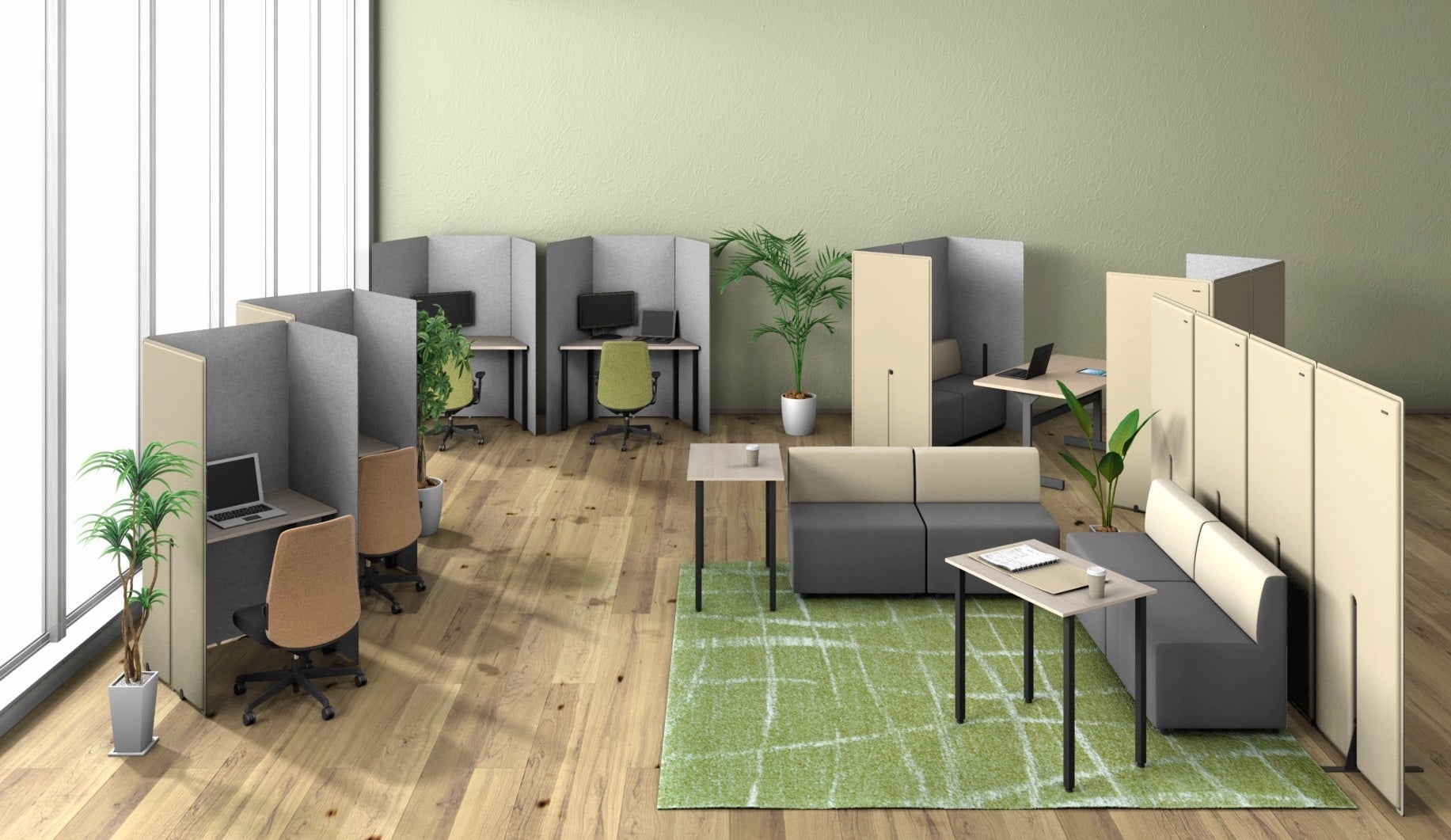 デスクワークやオンラインミーティング時の周囲の視線の悩みを解決するユニットタイプのパネル&ソファ。