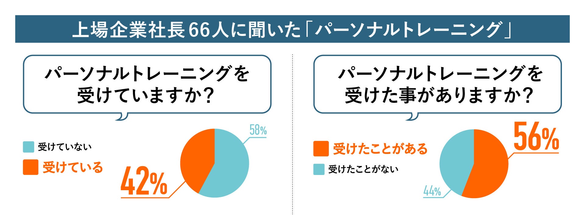 更に、上場企業の社長66名へパーソナルトレーニングに関するアンケート調査を行った結果、42%がパーソナルトレーニングを受けていると回答。56%がパーソナルトレーニングを受けた事があると回答しました。