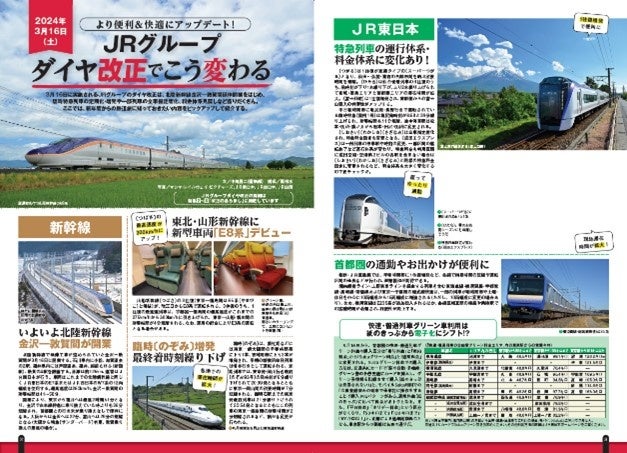 本誌の巻頭カラーページでは、いよいよ開業する北陸新幹線、金沢-敦賀間の情報や、新幹線をはじめとする目的地へのアクセスや利便性の向上など、JR各社のダイヤ改正によって人々の日常生活にどのような変化があるのか。さらに新型車両の情報なども掲載している。新年度から知っておきたい全国の改正情報を図解も交えて掘り下げている。