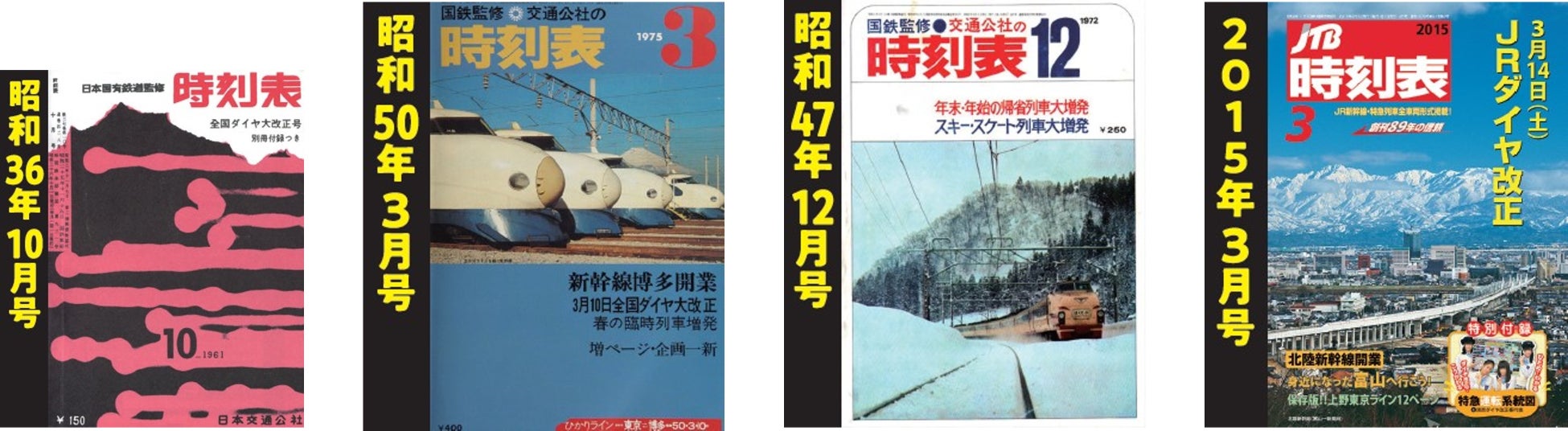 ▲デジタル復刻した過去の時刻表、各号の表紙