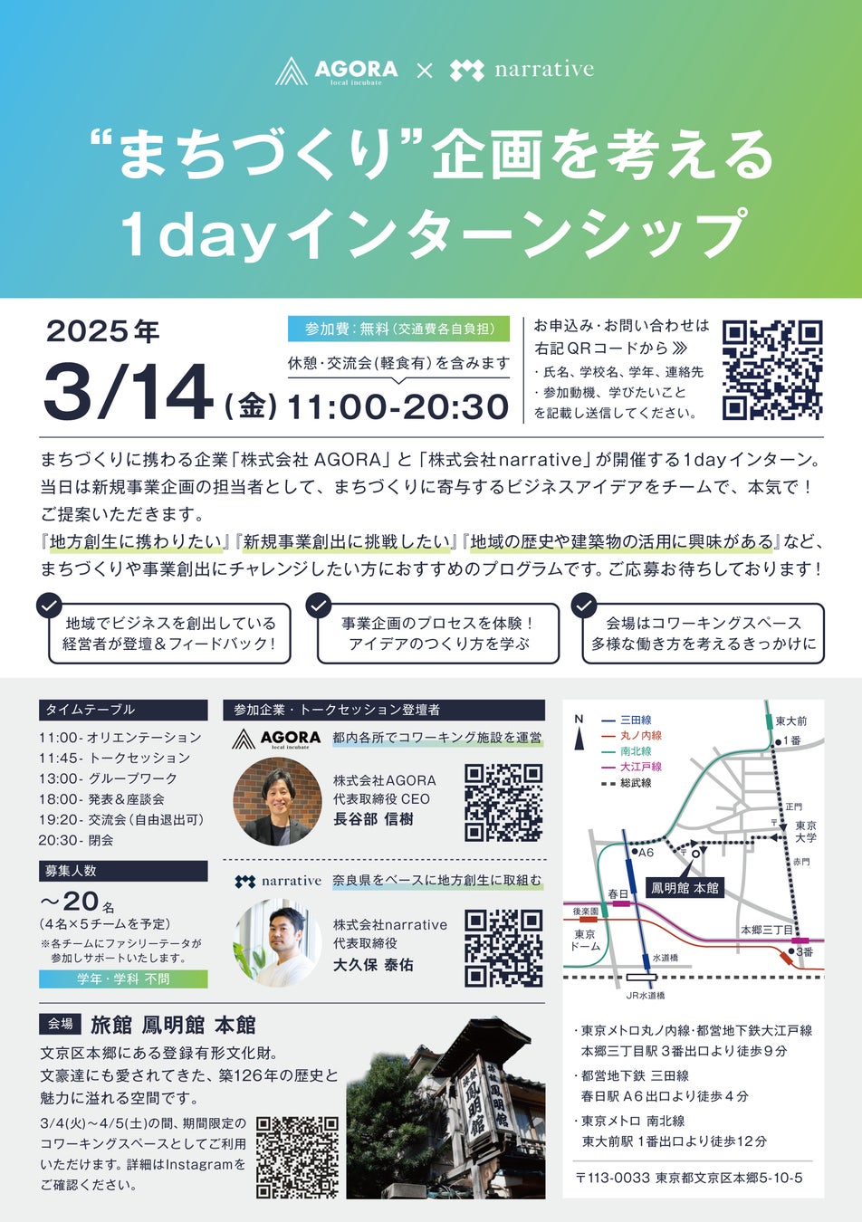 カフェや居酒屋など、飲食店を経営する株式会社キープ・ウィルダイニングのグループ会社であり、都内でコワーキングスペースを展開し創業支援を推進する、株式会社AGORA(読み:アゴラ、本社:東京都町田市、代表:長谷部 信樹)は、奈良県を中心に歴史的建築物(古民家)を使ったまちづくり事業を展開している、株式会社narrative(読み:ナラティブ、本社:奈良県奈良市、代表:大久保 泰佑)と共同で、地方創生イベント「”まちづくり”企画を考える1dayインターンシップ」を2025年3月14日(金)に文京区本郷の旅館鳳明館にて開催いたします。