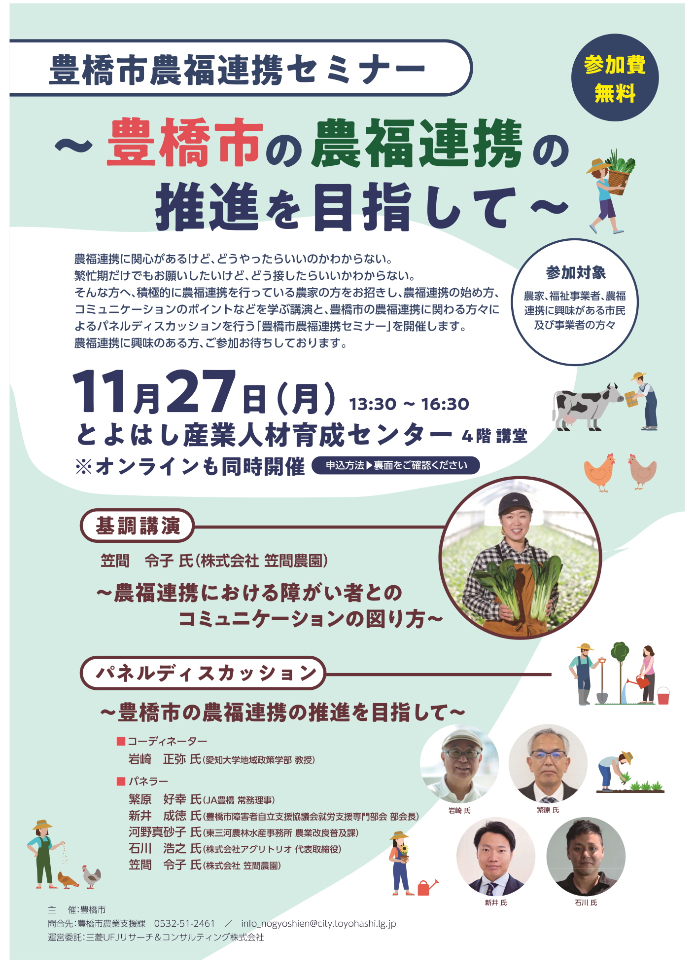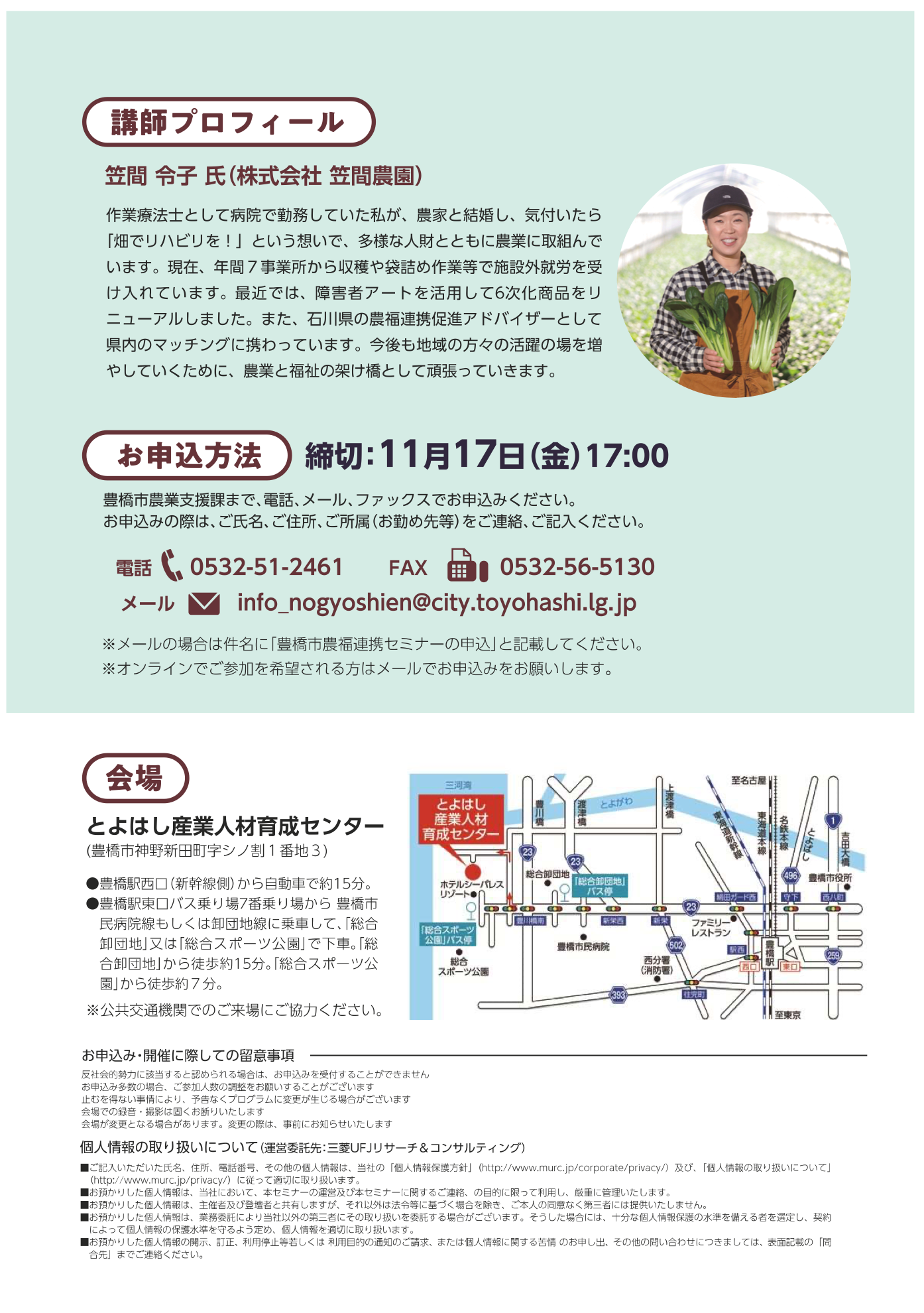 申し込みの締め切りは、2023年11月17日(金)午後5時。豊橋市農業支援課まで、電話(0532・51・2461)かメール(info_nogyoshien@city.toyohashi.lg.jp)、FAX(0532・56・5130)で申込みください。その際は、氏名、住所、所属(勤め先など)を記入してください。メ ールの場合は件名に、「豊橋市農福連携セミナーの申込」と記載してください。オンラインでの参加を希望する場合は、メールで申込みください。働き手を確保し福祉の役にも立てる農福連携に興味はあるが、一歩足を踏み出せない方の応募をお待ちしています!