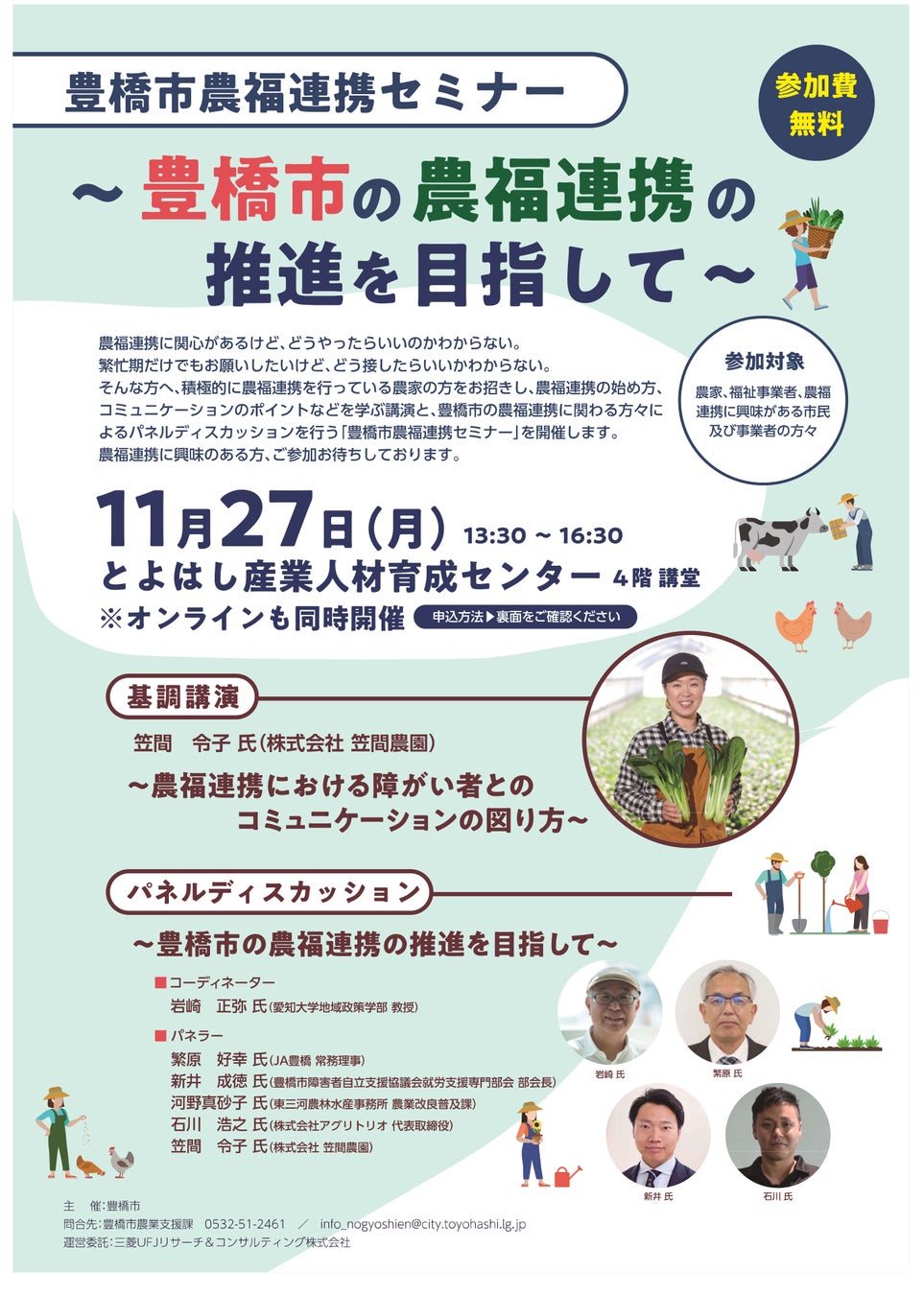 後半は、「豊橋市の農福連携の推進を目指して」をテーマにパネルディスカッションを行います。パネラーは笠間さんの他、JA豊橋常務理事の繁原好幸さん、豊橋市障害者自立支援協議会就労支援専門部会部会長の新井成徳さん、東三河農林水産事務所農業改良普及課の河野真砂子さん、農福連携のマッチングサービスを手がける株式会社アグリトリオ代表取締役の石川浩之さんです。コーディネーターは、愛知大学地域政策学部教授の岩崎正弥さんが務めます。 豊橋市で農福連携に関わってきた方々がパネラーとなっているので、より身近な話が聞けるチャンスです!