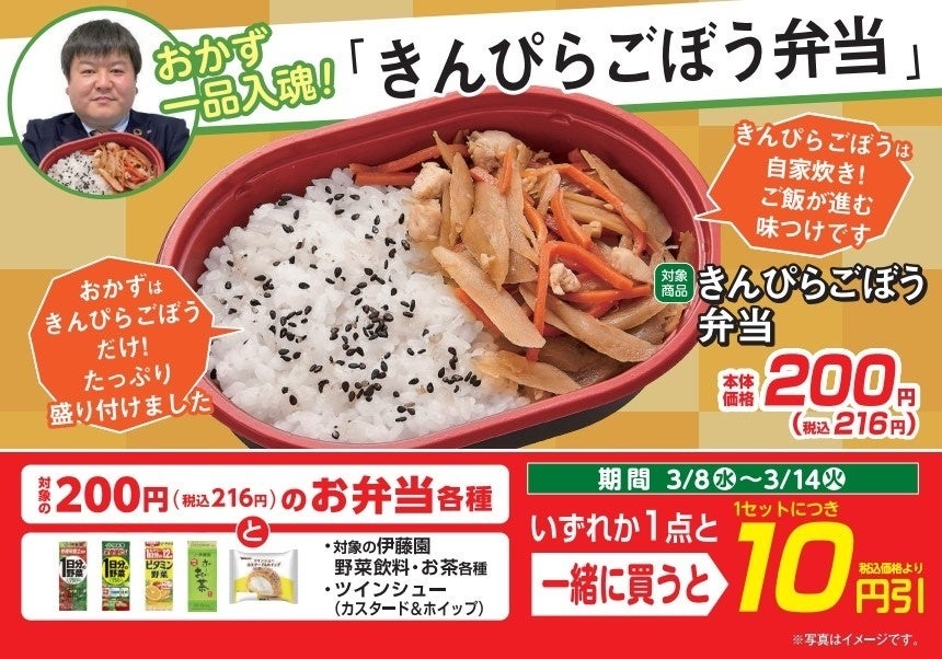 3月8日(水)から3月14日(火)までの1週間、新発売の「ひじき煮弁当」「きんぴらごぼう弁当」を含む200円