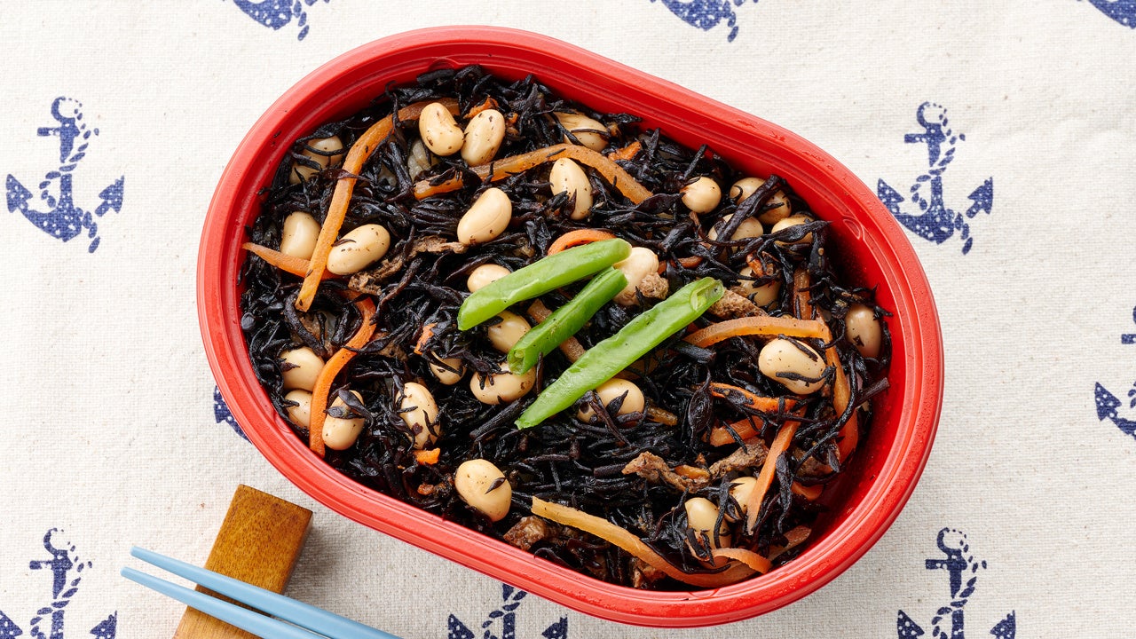 また、ひじき煮だけだと食感が弱いので、大豆を加え、インゲンをトッピングして彩りよく仕上げました。