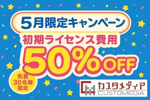 株式会社カスタメディア(本店:大阪府大阪市北区、代表取締役:宮﨑 耕史、以下 当社)は、当社が提供する「コミュニティサイト・マッチングサイト構築プラットフォーム『カスタメディア』」において、2025年5月1日(木)~5月31日(土)の期間限定・先着30社様を対象とした「初期ライセンス費用が最大50%OFF」キャンペーンを実施いたします。