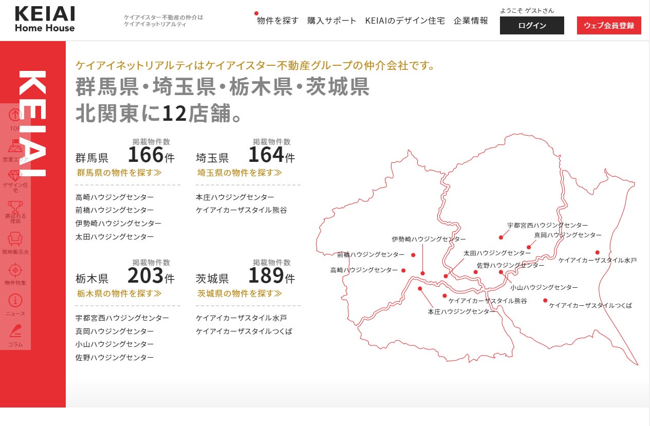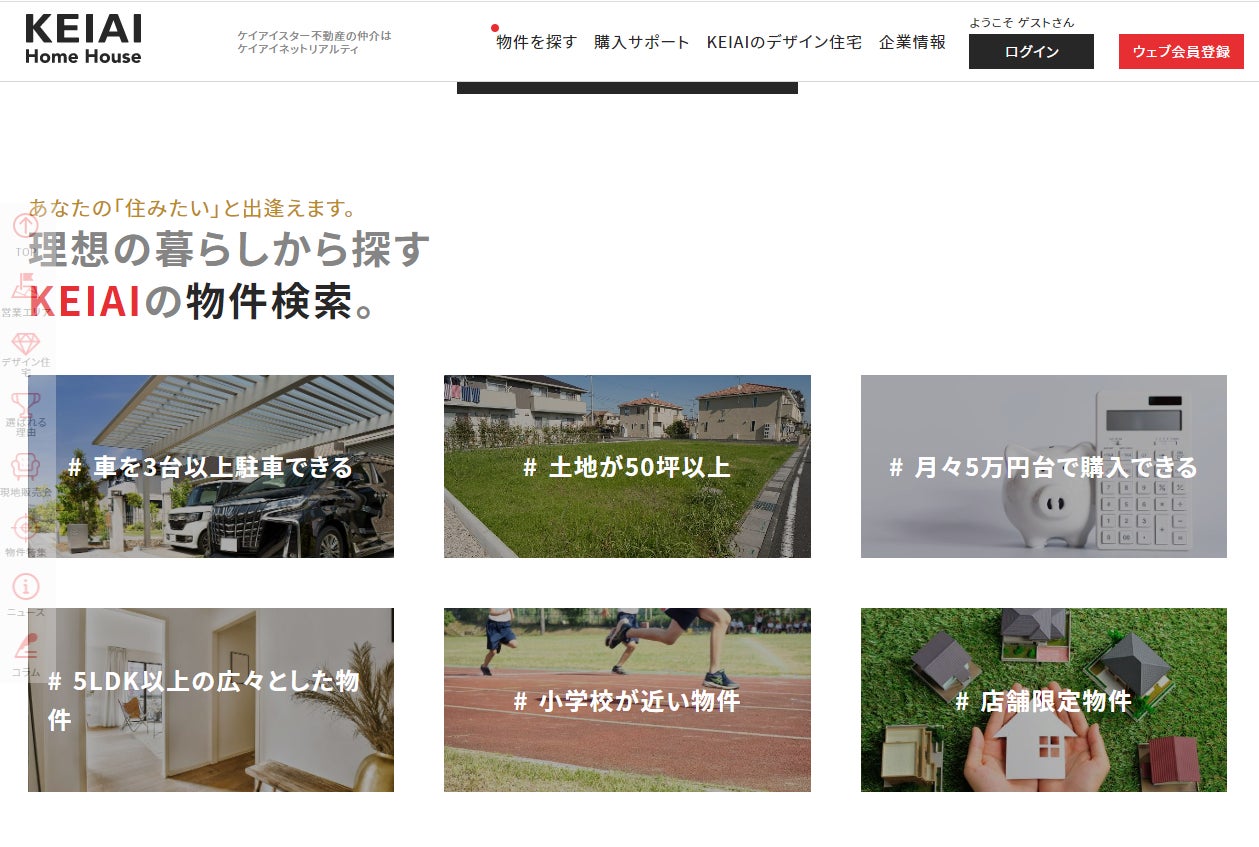 「KEIAI Home House」は、同社が運営する不動産情報サイトとして2021年3月に公開しました。厳選された不動産情報を毎日更新しており、平均700件~800件掲載しています。当サイトはこれまで、希望エリアから検索できる仕様で、住みたいエリア(県、市町村)をメインに、間取や価格の条件から検索が出来るようになっていました。