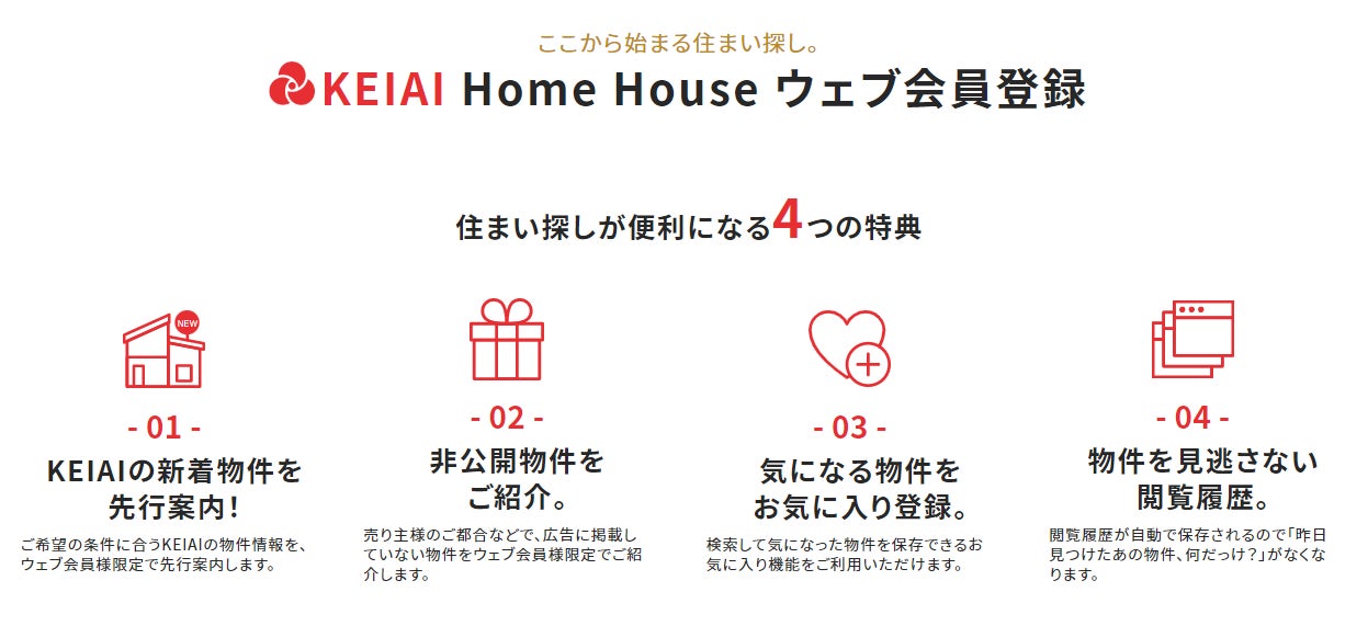 リニューアルした「KEIAI Home House」では、新たに会員登録制度を設けました。ご登録頂くと会員限定の物件が閲覧可能となり、新規物件を優先的にご案内します。また、不動産のプロによるマッチング診断を受けることができ、幅広く住宅購入を検討することができます。