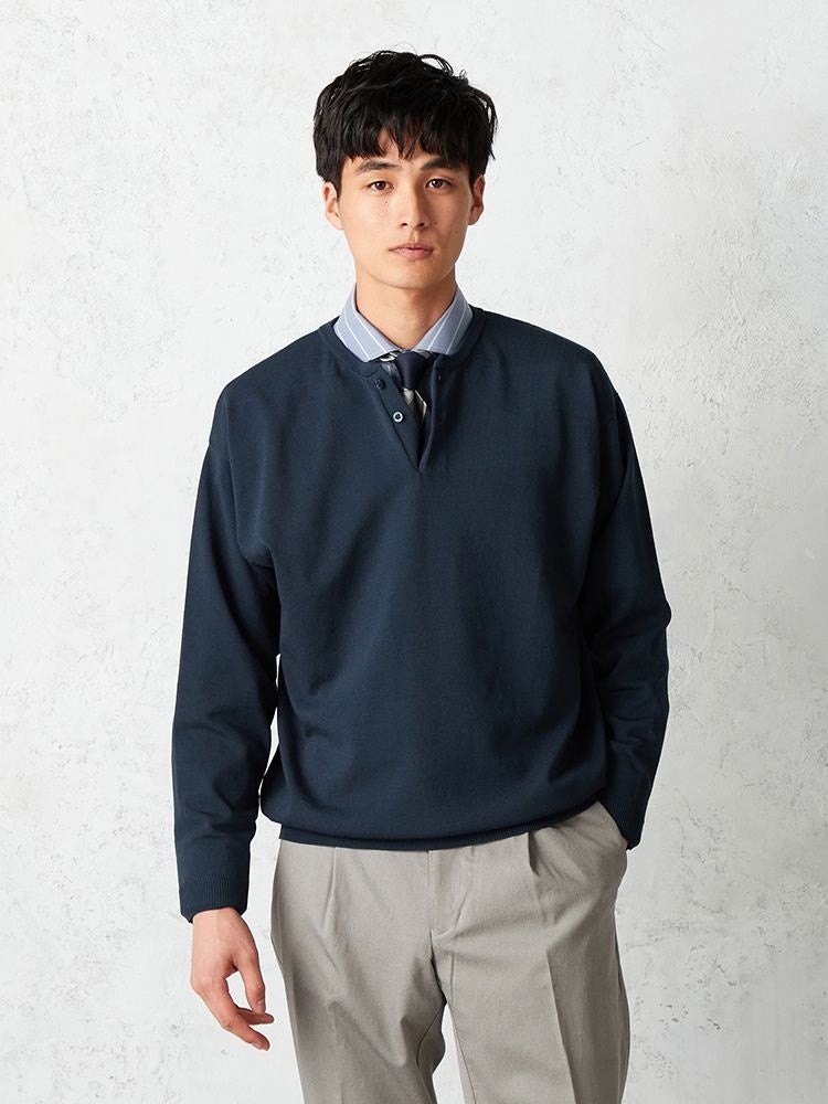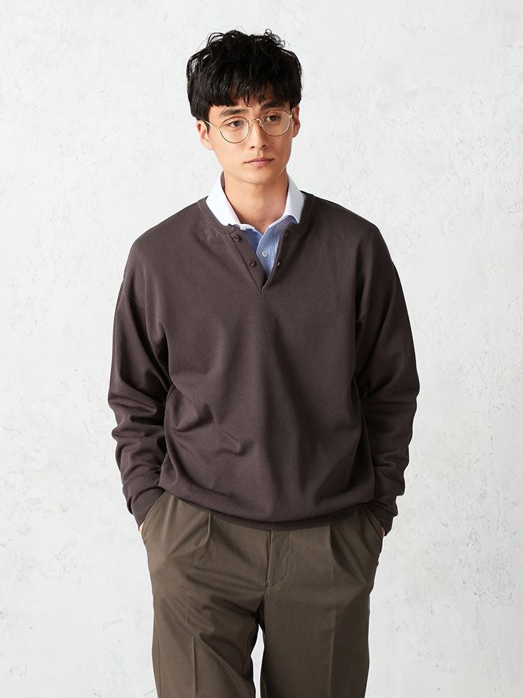衿デザインがワンポイントになるヘンリーネックニットが登場!トレンド色をニュアンスカラーに仕上げた大人な一着一枚での着用からシャツスタイルにオンまで幅広く着回し可能