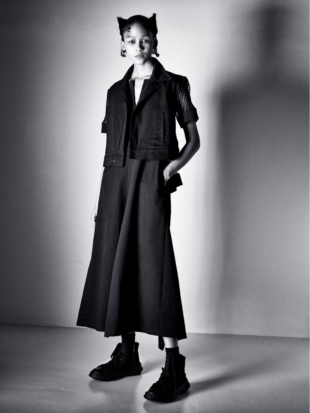 厚地のコットン生地にメッシュのハーフスリーブを組み合わせたジャケットと、細長いV字開きがシャープなショルダーストラップドレスのセットアップ。凛とした風貌を保ちつつ、バイオ加工が施された生地は肌触りが柔らかく、ナチュラルなストレッチ感を持ち合わせている。