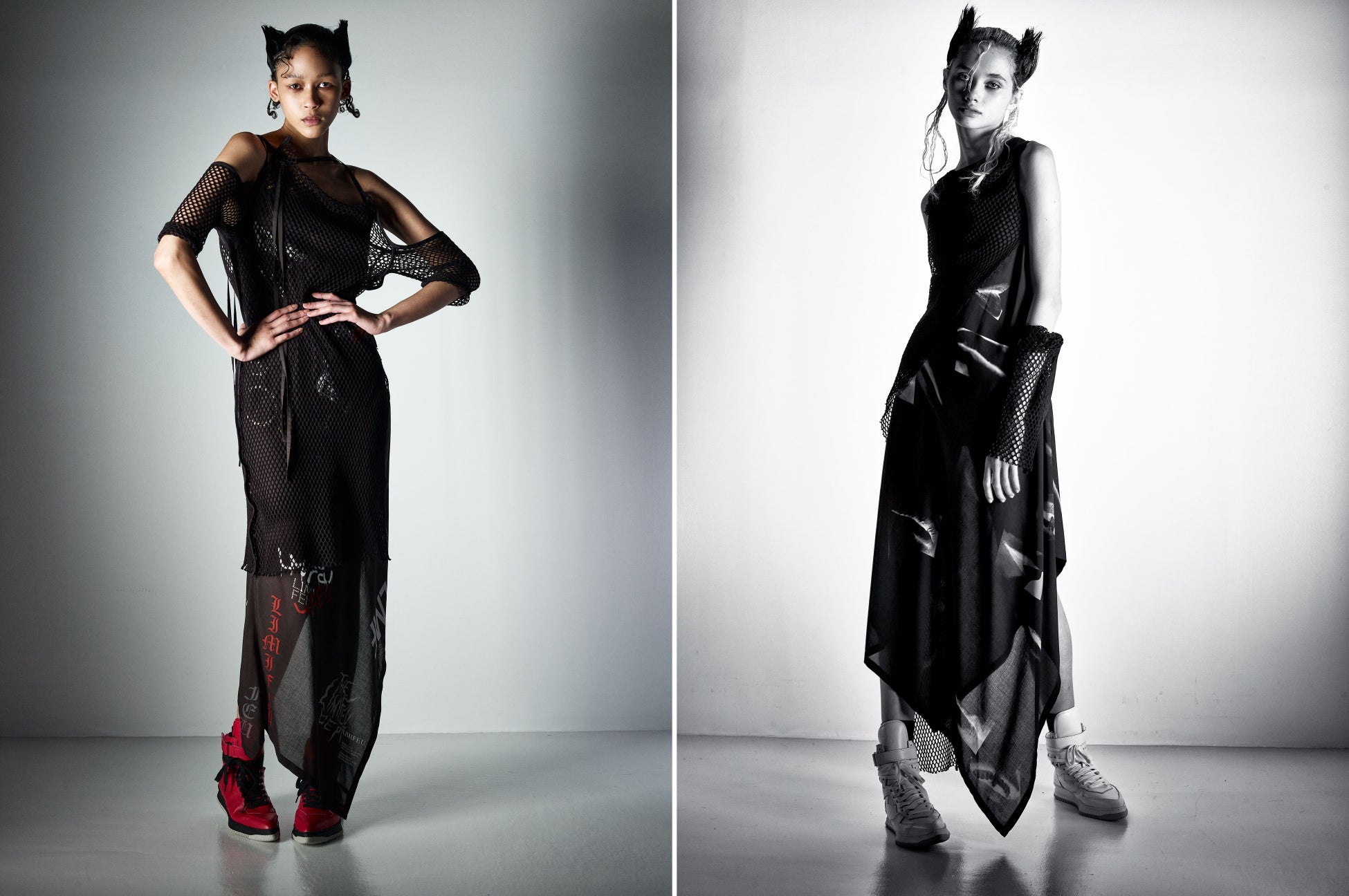 ブランド20年の軌跡を辿るように、様々なプロダクツで用いた異なるフォントのロゴをコラージュしたプリント。軽やかでドレープ性のあるシアーなドレスに上品な編み目のメッシュ・キャミソールが組み合わされている(左)。一見花弁のように見える柄は、実際に焼き跡をつけた唇の写真を大胆に散りばめたプリント。首元や肩のラインが美しく見えるボートネックのフレアワンピースにも、前身頃からウエスト、ヒップにかけてメッシュ素材が組み合わされてる(右)。