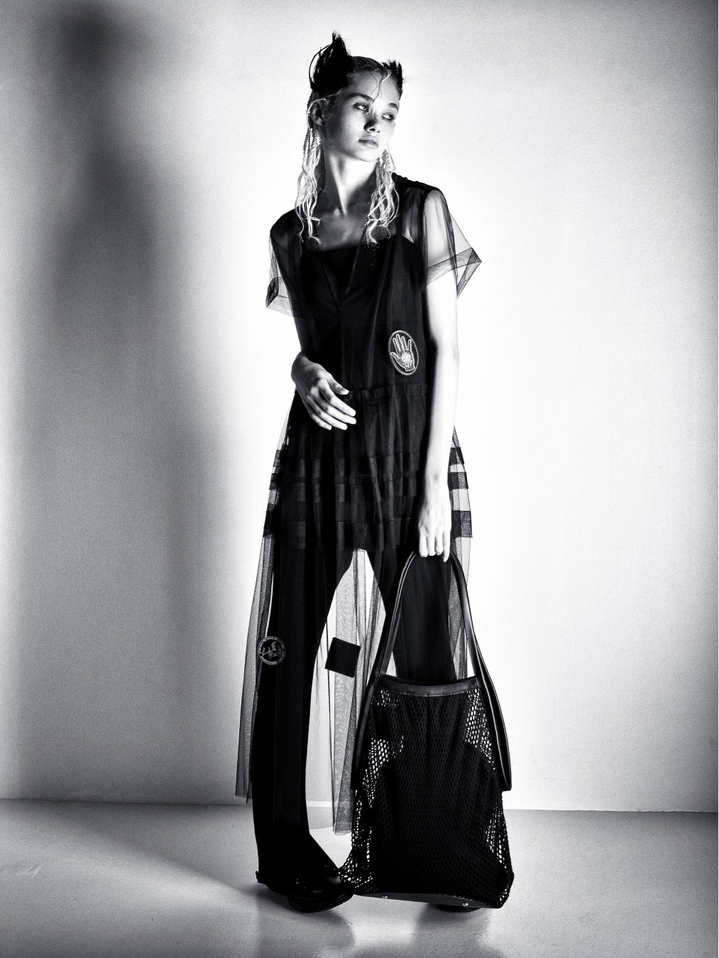 メッシュより更に繊細なソフトチュールのドレス。ローウエスト部分にティアードが配されている。面ファスナー仕様のオリジナルワッペンが備えられており、好きな場所に付け替えることができる。メッシュボディにオリジナル巾着がセットされたレザーハンドルのバックにもオリジナルワッペンが装備されている。
