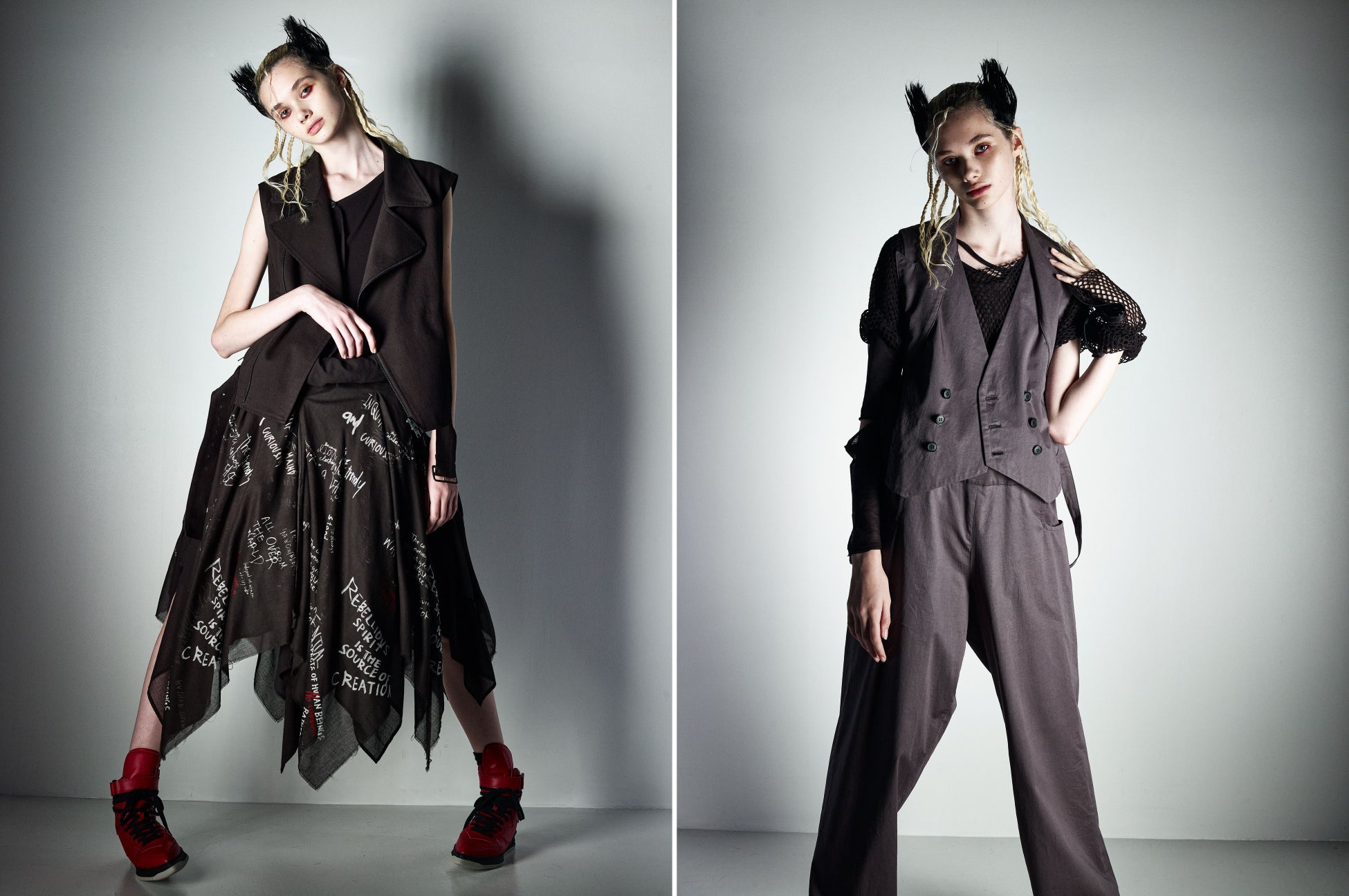 アクティブなライダーススタイルのベストに、たおやかに揺れ動くエアリーなアシンメトリーのフレアスカート。協和しない遊び心は新しいリズムを刻む(左)。クラシカルなダブル前のジレは、ボレロのように肩を包み込むパターンから派生したラペルが特徴。スモーキーグレーとブラックのスタリングが新鮮。