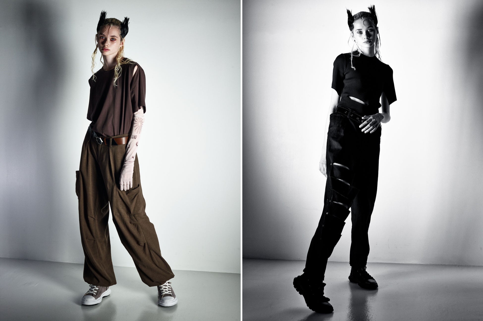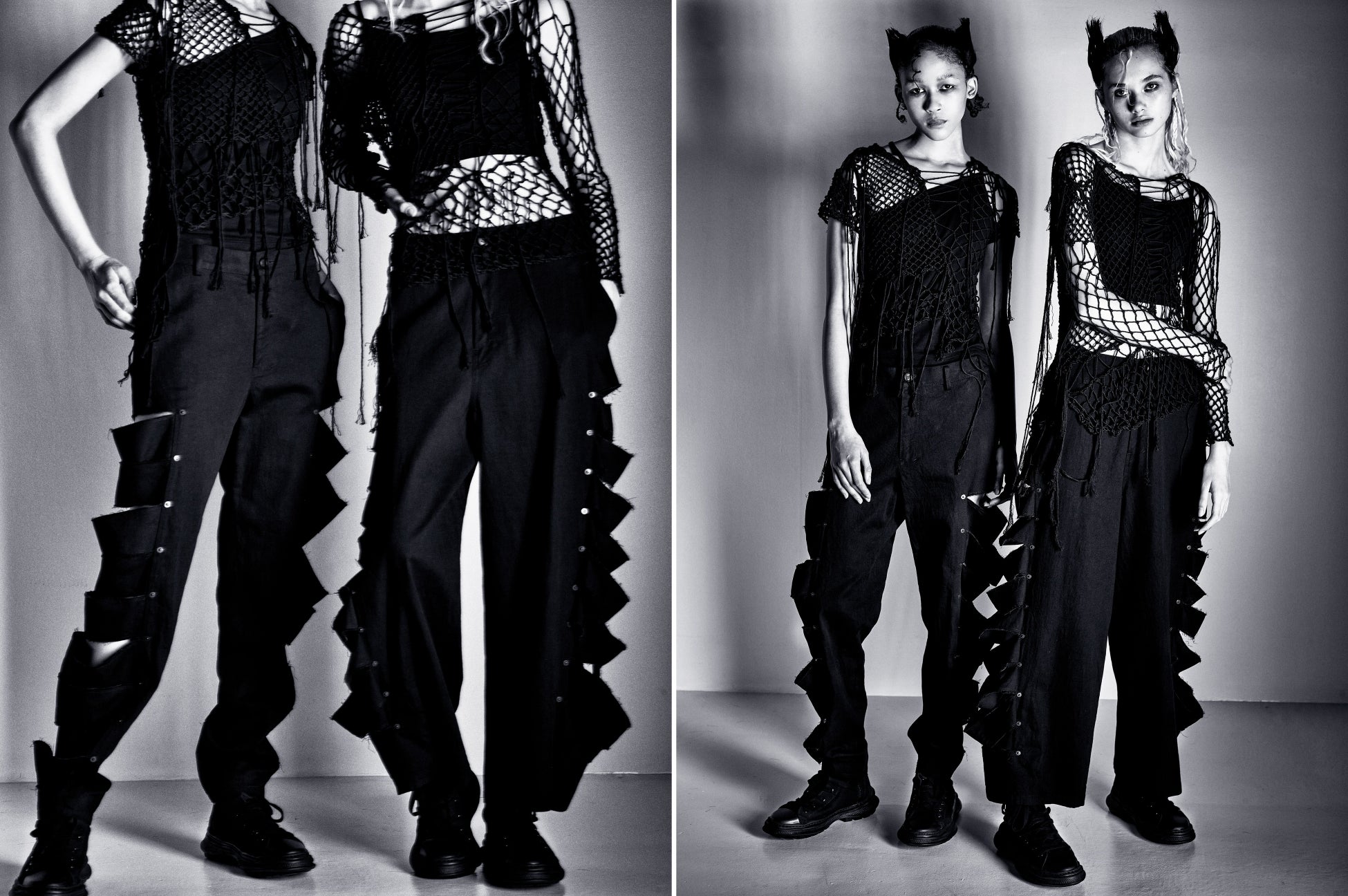 思いのままノッチを切り込みことで既成のシルエットから解き放たれた大胆なブラックデニムと、巧みな手作業によって大小異なる網目の組み合わせが実現したニット。熟考されたルーズ感とアシンメトリーのシルエットから静かながら譲らない意志を感じる。