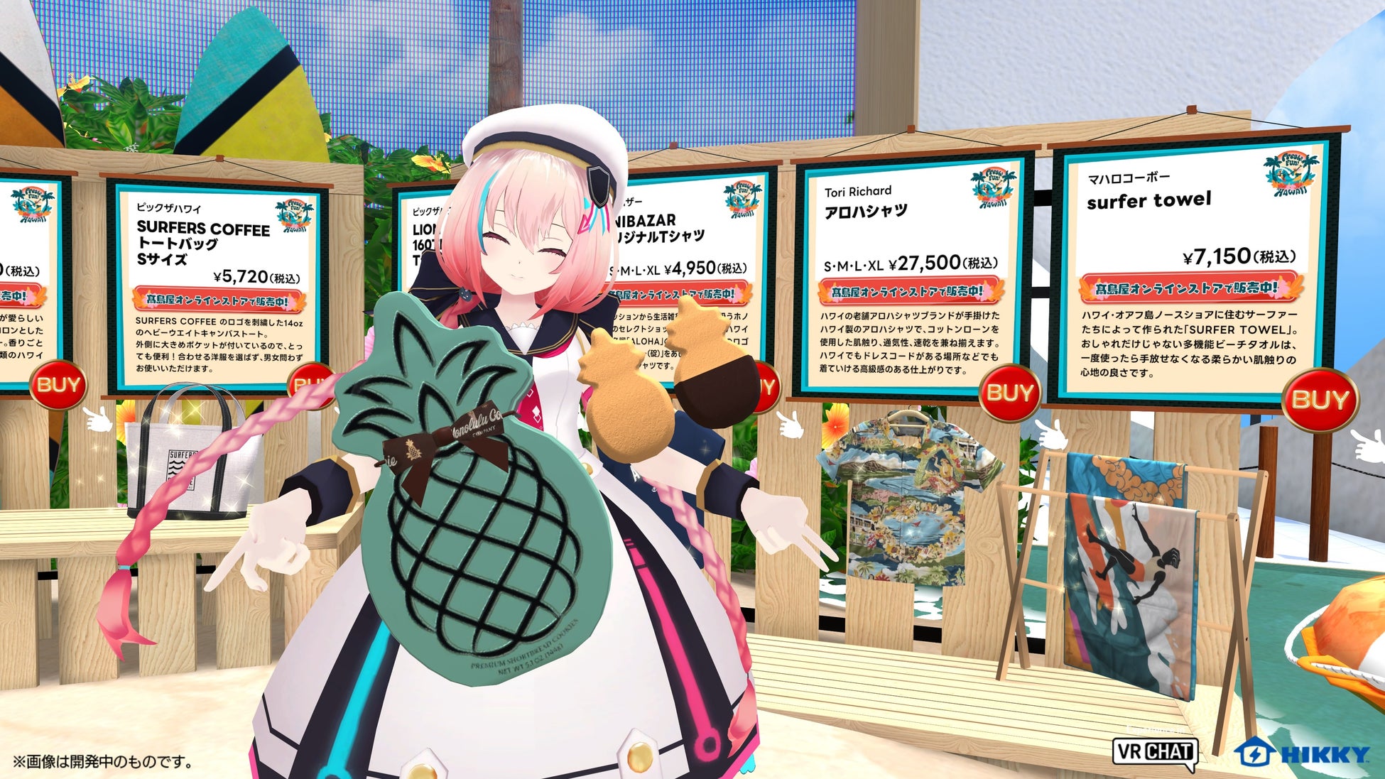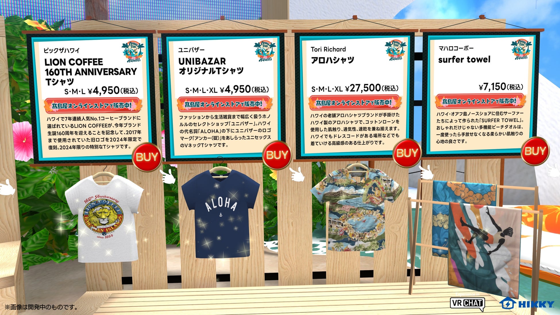 今回「パラリアル大阪」に展開する髙島屋のブースでは、ビーチやヤシの木などハワイらしさをふんだんに感じられる装飾と、リアル店舗の催事でも販売されるアロハシャツやハワイアンポップコーンなどのハワイに関連した商品を3Dモデルで展示し、気に入ったアイテムはその場から髙島屋オンラインストアに遷移し購入することが可能です。