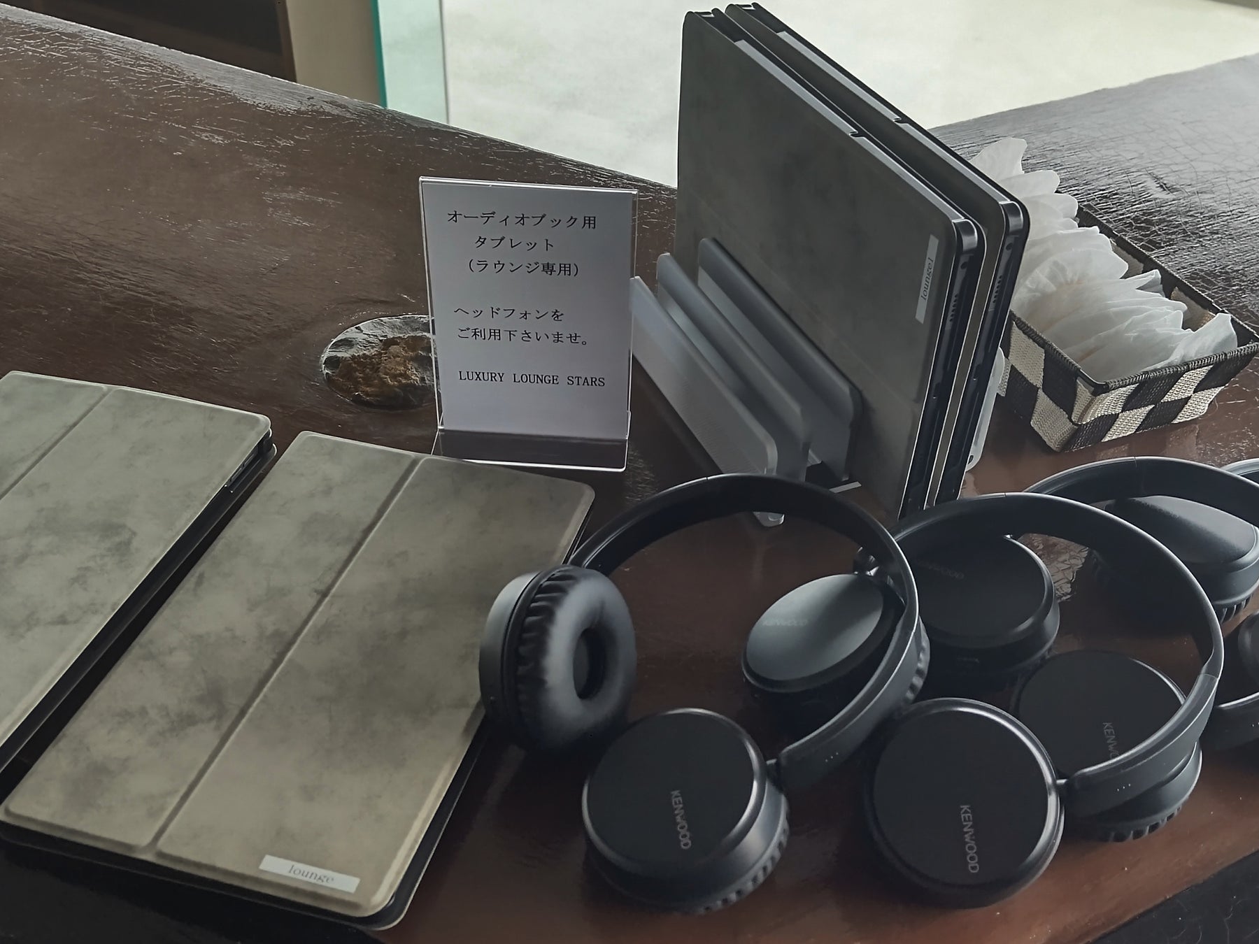 角部屋スイートルーム・デラックスツインルーム・aiboルームへご宿泊のお客様専用ラウンジ「LUXURY LOUNGE STARS」に、オーディオブックが聴ける専用のタブレットとヘッドフォンが設置され、お客様は夜景を見たり、コーヒーやお酒を飲んだりしながら、お好きな本を耳で聴いて楽しむことができます。