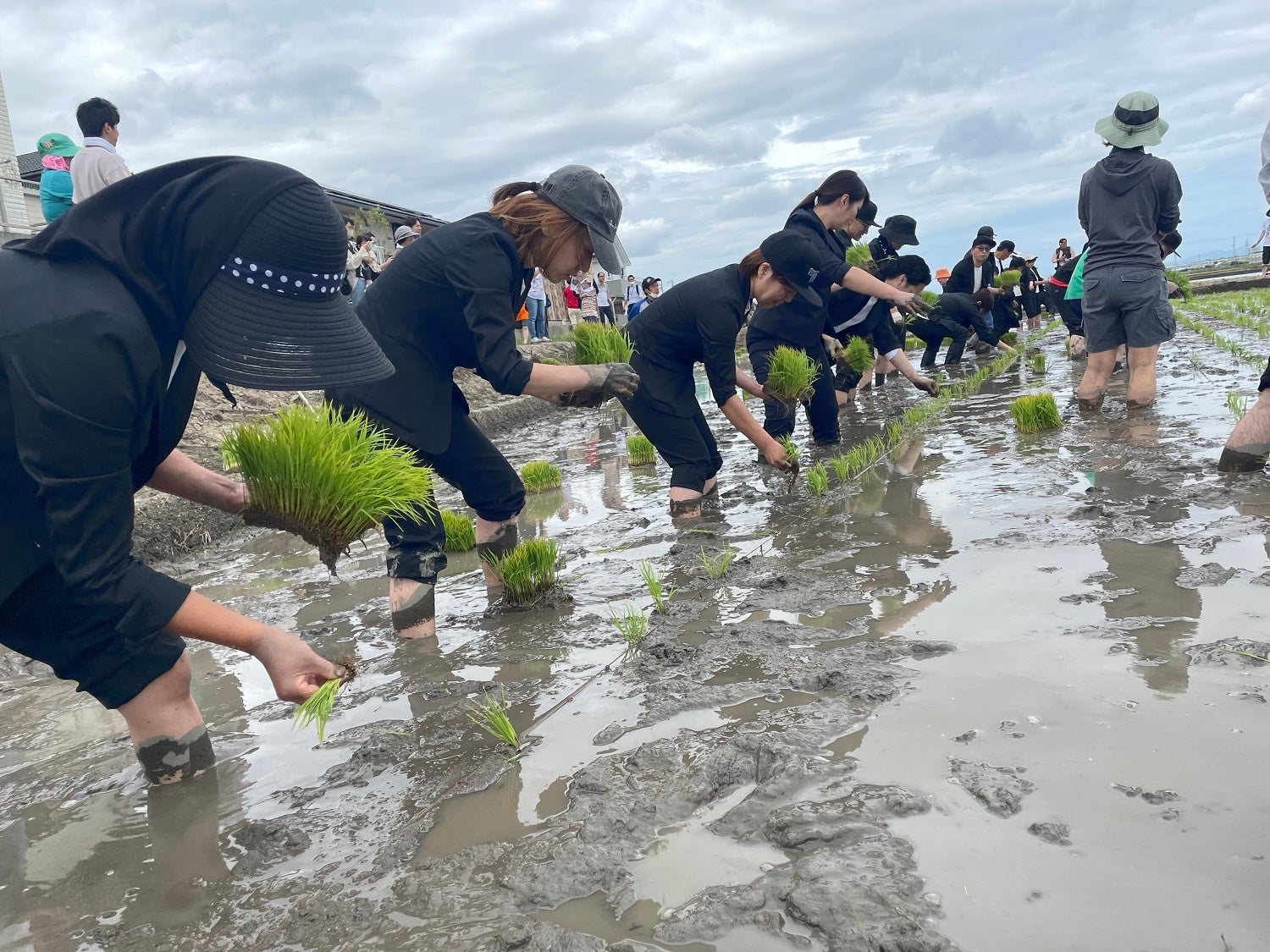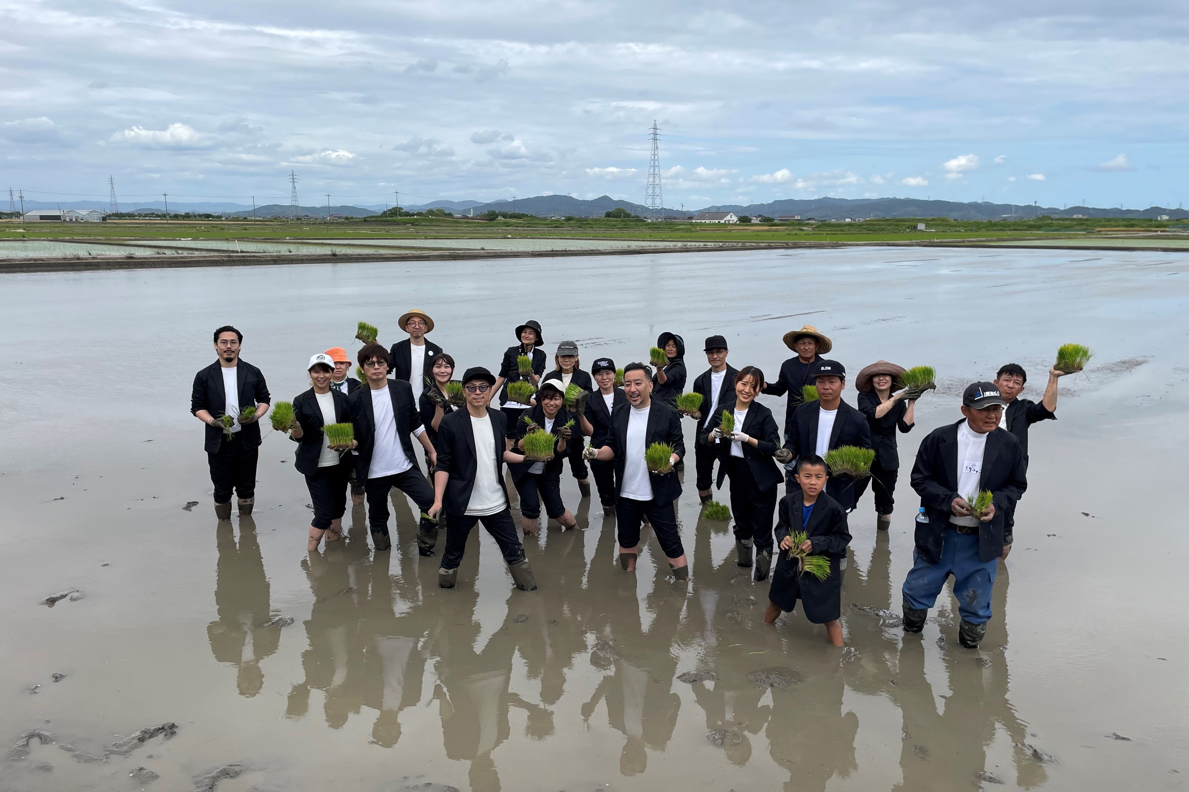 本件は、2021年からWWSの公私ともに愛用者である田村淳が昨年の米作りプロジェクトの際に、WWSのスーツを着用して田植えを行ったことがきっかけとなりました。365日自宅洗濯機で丸洗いでき、伸縮性や撥水・速乾・防汚に優れたWWSであれば田植え時に着用しても機能的に問題なく、スーツを着用して作業をすることで特別感がでることから、今年はサロンメンバーの中から11名の有志を募り『スーツ田植え隊』を発足しました。
