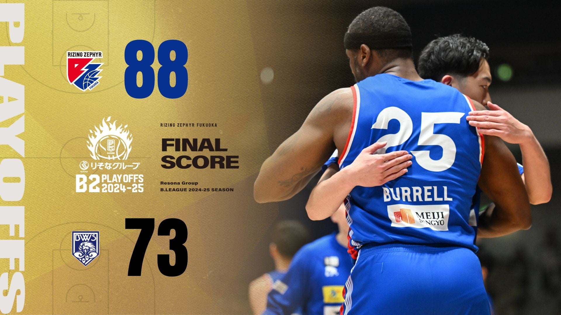 2025年5月5日(月・祝)に開催した、りそなグループ B2 PLAYOFFS 2024-25 クォーターファイナル【ライジングゼファーフクオカ vs.福井ブローウィンズ】は、“福岡 88-73 福井”で福岡の勝利となり、5月10日(土)から開催されるセミファイナル進出を決めました。