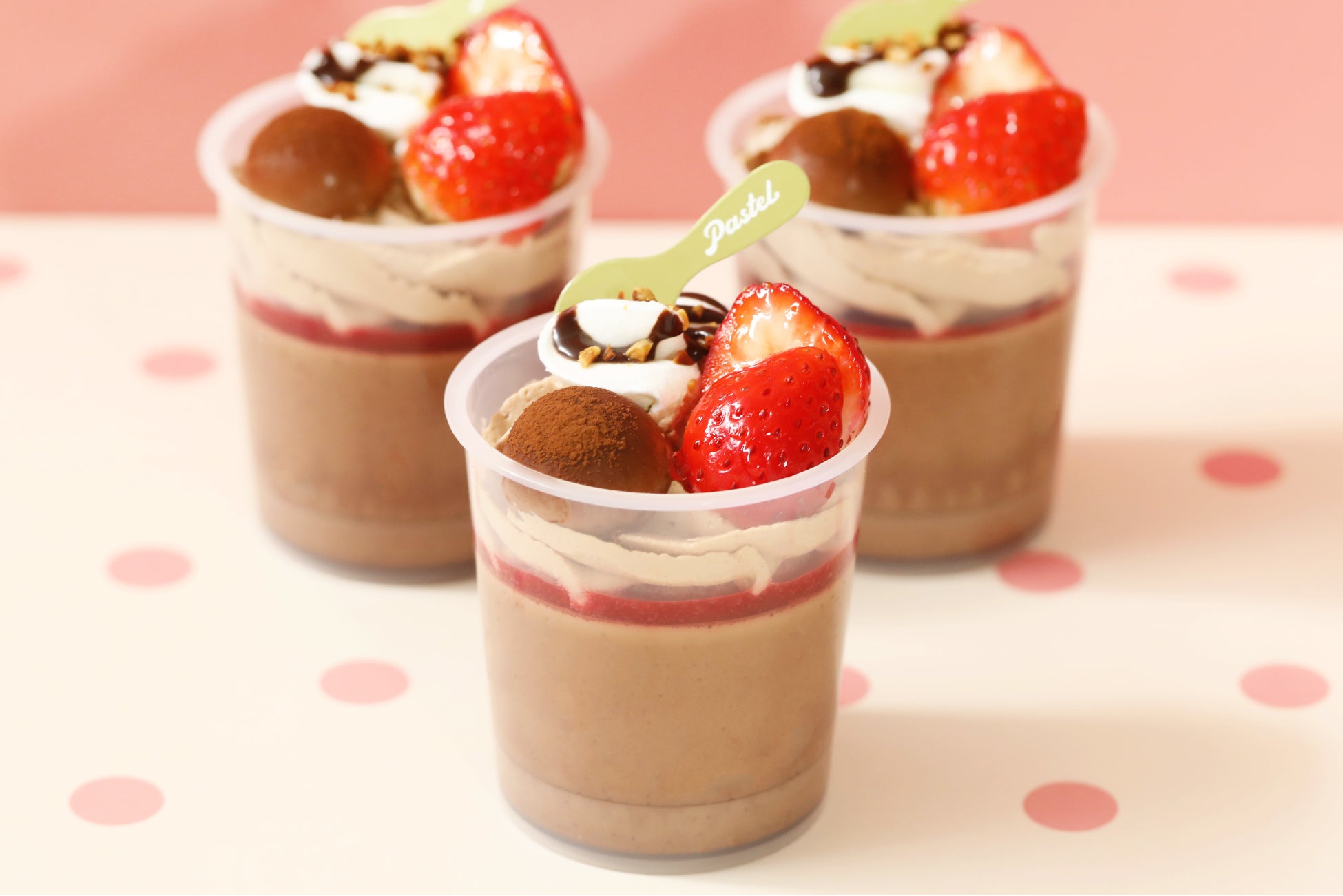 また、パステル初の試みとして、チョコプリンとチョコレート味の杏仁豆腐をかけ合わせました。なめらかな食感のチョコプリンともちもち食感の杏仁豆腐。華やかなビジュアルとチョコづくしな味わいは、バレンタインシーズンのデザートにおすすめです。